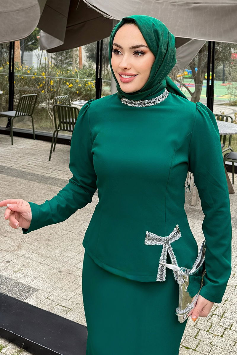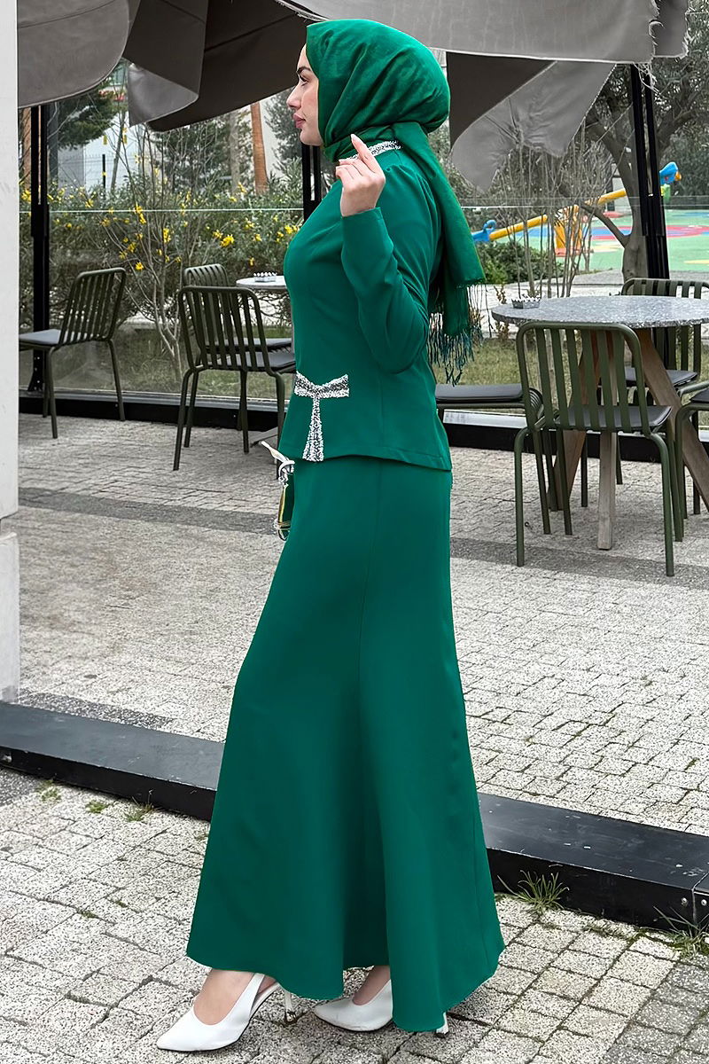 The Stone Bow Detailed Suit is an exclusive hijab model that offers elegance and comfort combined. Made from Dabıl Crepe fabric, this suit guarantees quality and durability. With its clerical collar blouse and stone bow detailing, it provides a sophisticated look, while its lining-free design ensures it is light and comfortable. The blouse features a practical zipper at the back, and the skirt has a zippered waist for ease of use. This suit is perfect for adding a dazzling elegance to your special occasions and events. Note: The product worn by the model is size 38 and should only be dry cleaned.