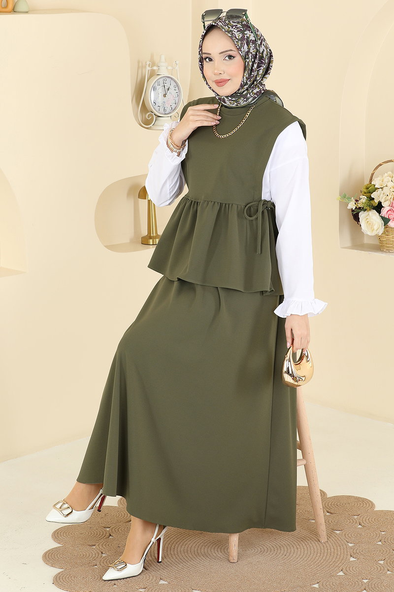 Product Feature : It is a new season hijab fashion product. The product has side usable laces. It has a button that can be used from the back. The product has a Upright collar. The product has a zipper at the Belden part. The product is lace-up. The skirt has a zipper and elastic waist. There may be a tonal difference in the product due to concept photo shoots.