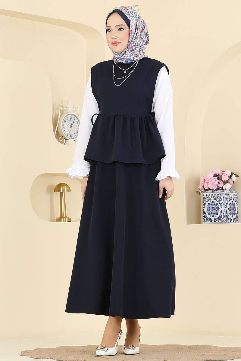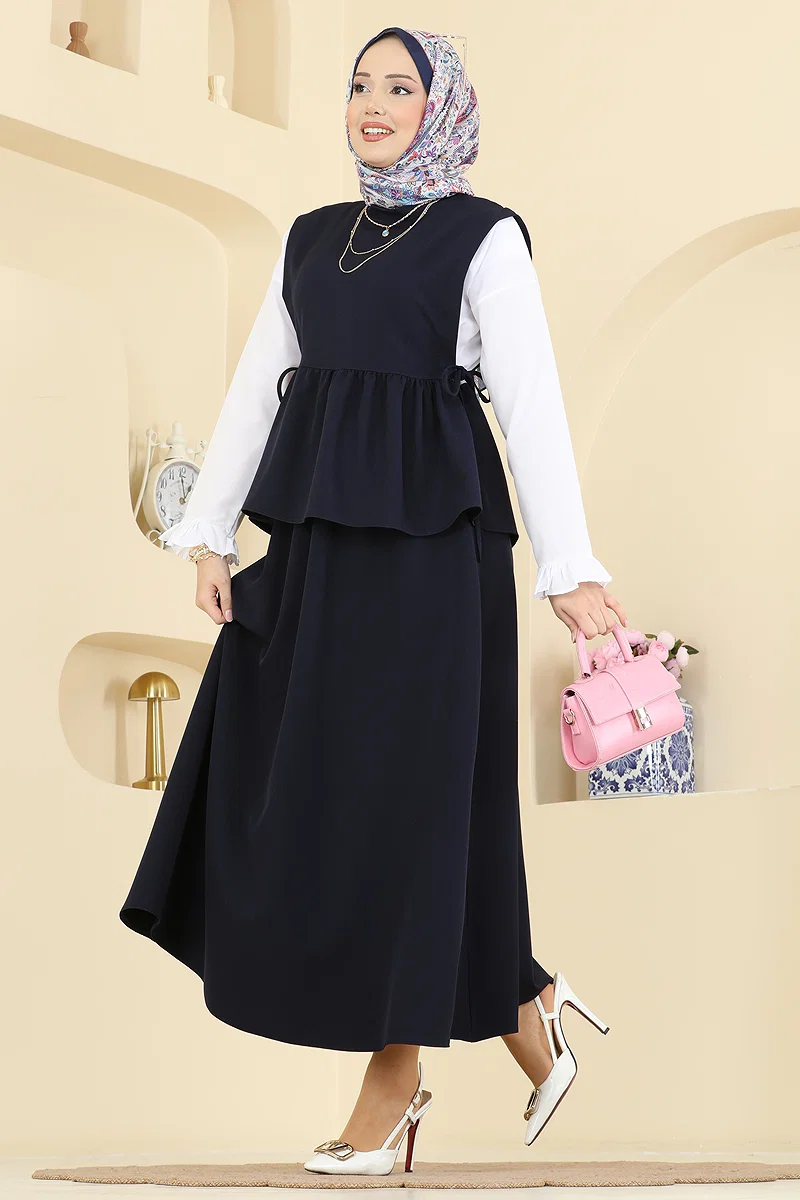 Dabıl's 2-Piece Skirted Set COMBINATION is specially designed for those who prefer modest dressing. Suitable for all seasons, this ensemble is made from durable and breathable Dabıl Crepe fabric. You can maintain its like-new quality by washing it at 30 degrees. This stylish and practical design features a stand-up collar, adjustable side drawstrings, a back button, and a skirt with a zippered and elastic waist. Offering an elegant look in any setting, this set is ideal for those seeking a combination of comfort and style.