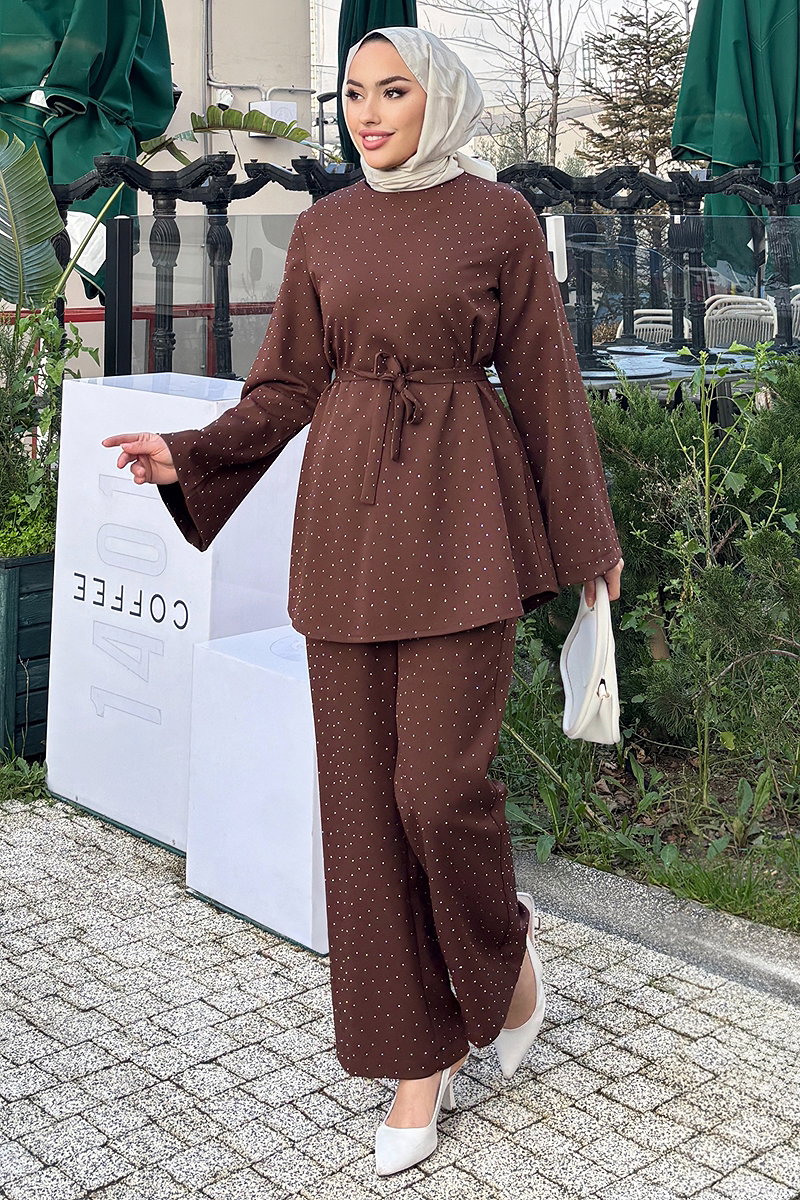 المنتج لديه ياقة دائرية. غير مبطنة. المنتج به سحاب في جزء من الخلف. يتم لصق الحجارة. الحزام متضمن، ،يمكن استخدامها حسب الرغبة خصر البنطال مرن. قد يكون هناك اختلاف في الدرجة اللونية في المنتج بسبب التقاط الصور الفوتوغرافية.