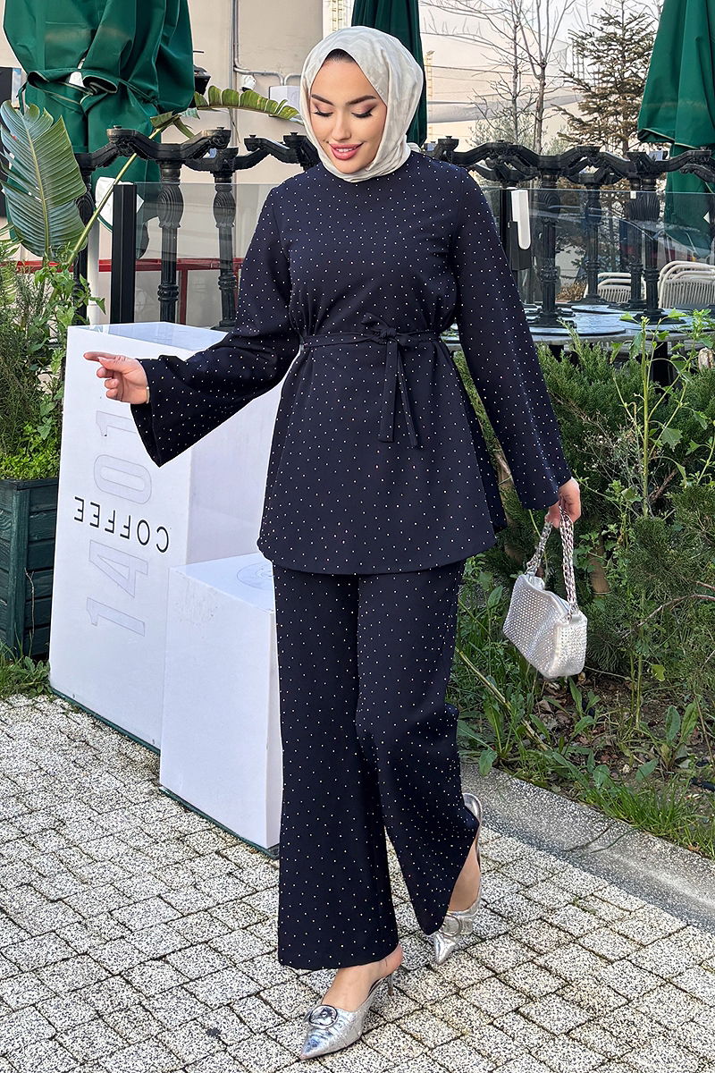 Product Name: Stone Detailed Dual Set COMBIN. This chic and practical hijab set can be comfortably used in all four seasons. It can be washed at 30 degrees on a delicate wash cycle. Made from durable dabıl fabric, this product offers a modern look with its bike neck and zipper back design. The eye-catching stone details add an elegant flair, while the specially sewed belt, which prevents waviness, completes the design. The belt is removable and can be adjusted according to personal preference. The waist of the pants is elastic, ensuring a comfortable fit. This set, suitable for both everyday wear and special occasions, will become an indispensable part of your wardrobe.