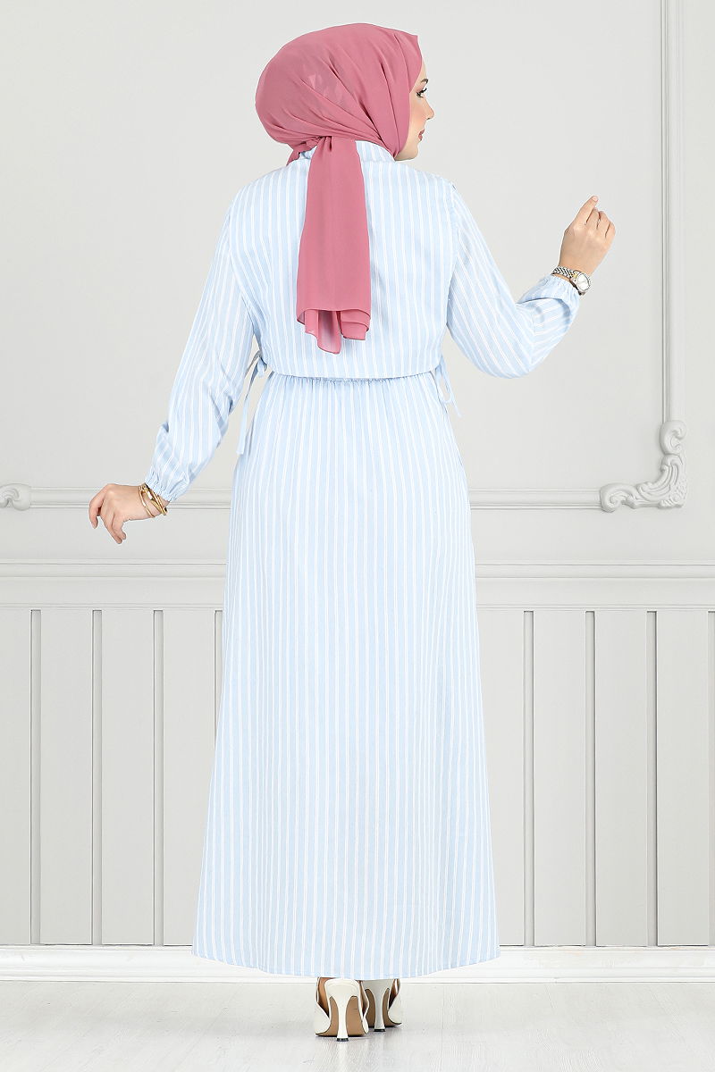 The Bolero Look Dress model is a hijab-fashion option that can be used comfortably in all seasons. It is made from poplin fabric and can be maintained with gentle washing. It has a stylish appearance with a shirt collar and front button details. This model, designed as a combination of a bolero and a dress, features elasticated waist and cuffs, along with drawstrings at the waist and pockets for practical use. Its unlined structure and back zippered design also offer comfort. The model is size 2.