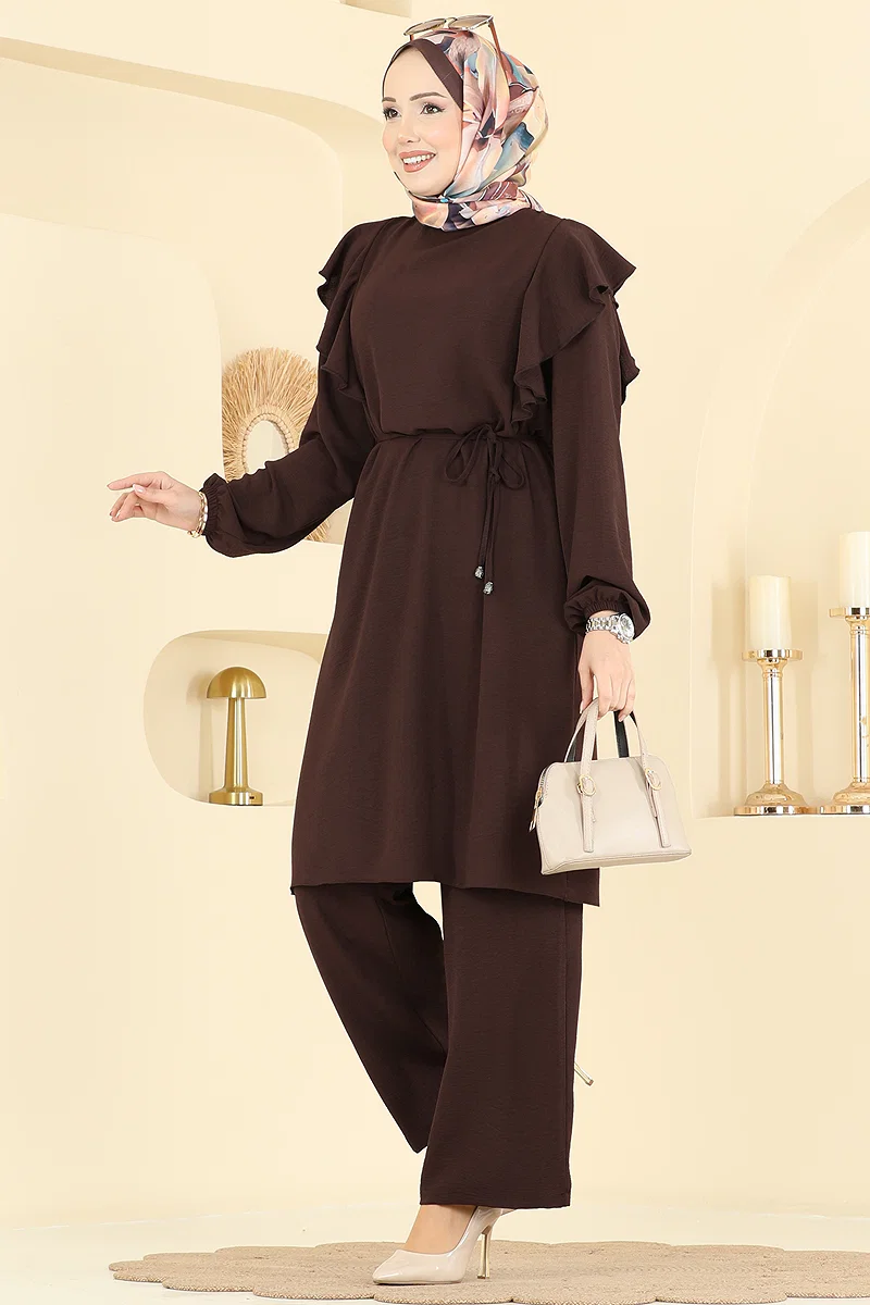 Introducing the chic and innovative Frill Detailed 2-Piece KOMBIN Suit, revolutionizing the modest fashion scene! Suitable for all seasons, this ensemble is made from aerobin fabric, offering day-long comfort due to its lightness. It is easy to maintain with its machine washable feature at 30 degrees on a delicate cycle. The suit presents a modern and practical look with its bicycle neckline and an additional button at the back. The belt usage is optional; you can choose not to use it. The elastic waistband and cuffs on the pants ensure ultimate comfort. Perfect for those who value both style and comfort!