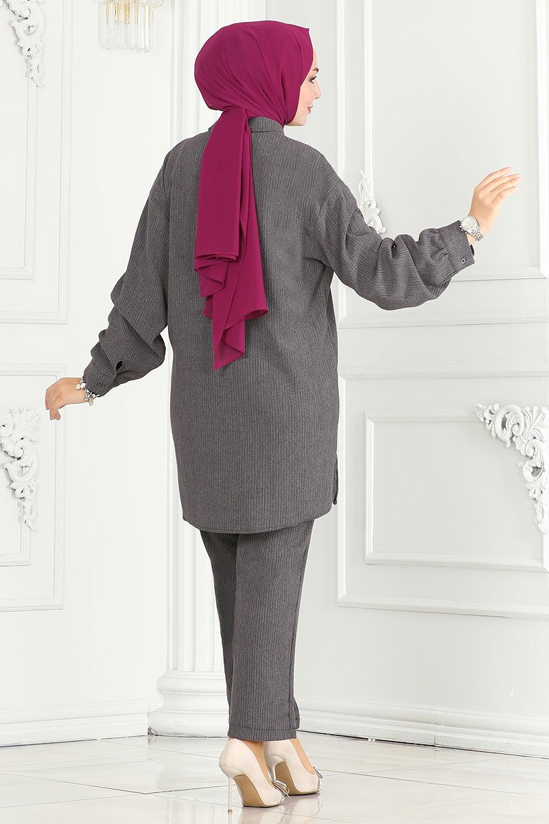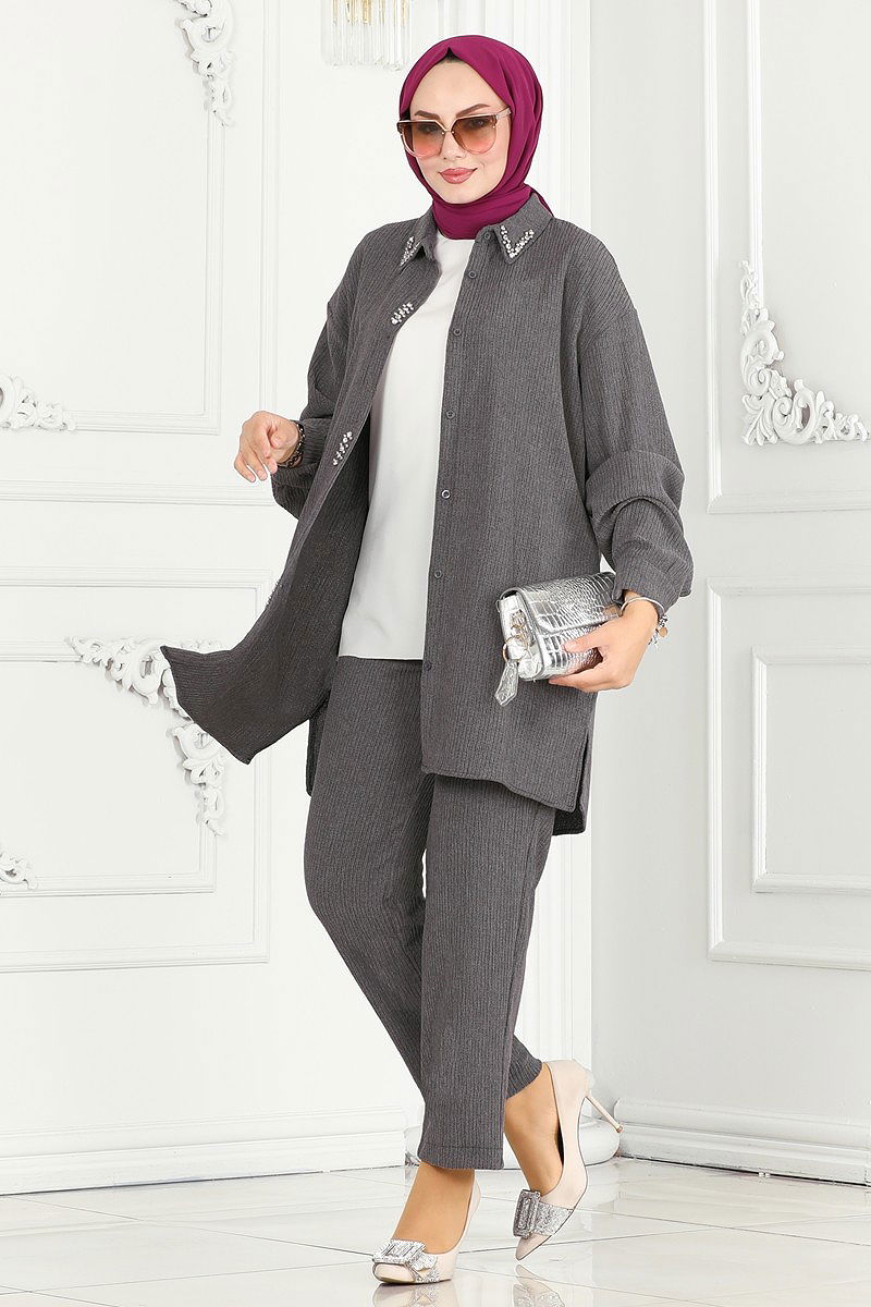 Product Feature : It is a new season hijab fashion product. The product has a Shirt collar. The product has From the front buttons. The tunic has a side slash.. Unlined.. Stone details are pebble. The waist of the trousers is elastic. Cuff buttons are active. There may be a tonal difference in the product due to concept photo shoots.
