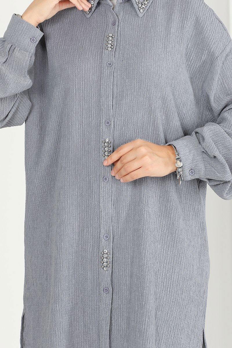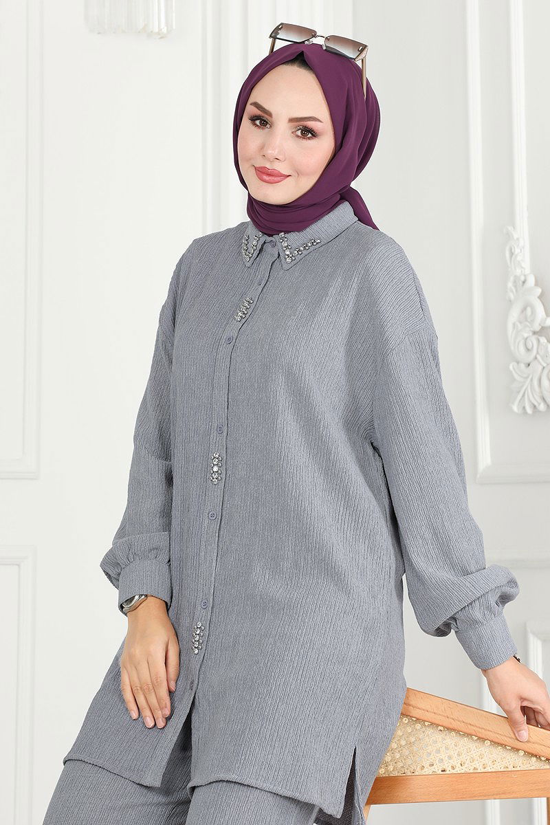 المنتج لديه ياقة القميص. المنتج به أزرار من الأمام. البلوز تحتوي على فتحة. غير مبطنة.. التفاصيل الحجرية محفورة. خصر البنطال مرن. أزرار الكفة نشطة. قد يكون هناك اختلاف في الدرجة اللونية في المنتج بسبب التقاط الصور الفوتوغرافية.