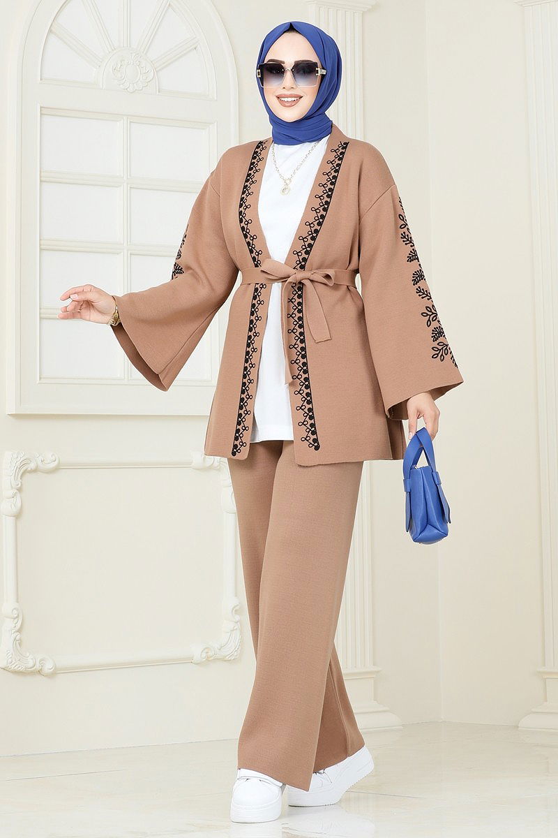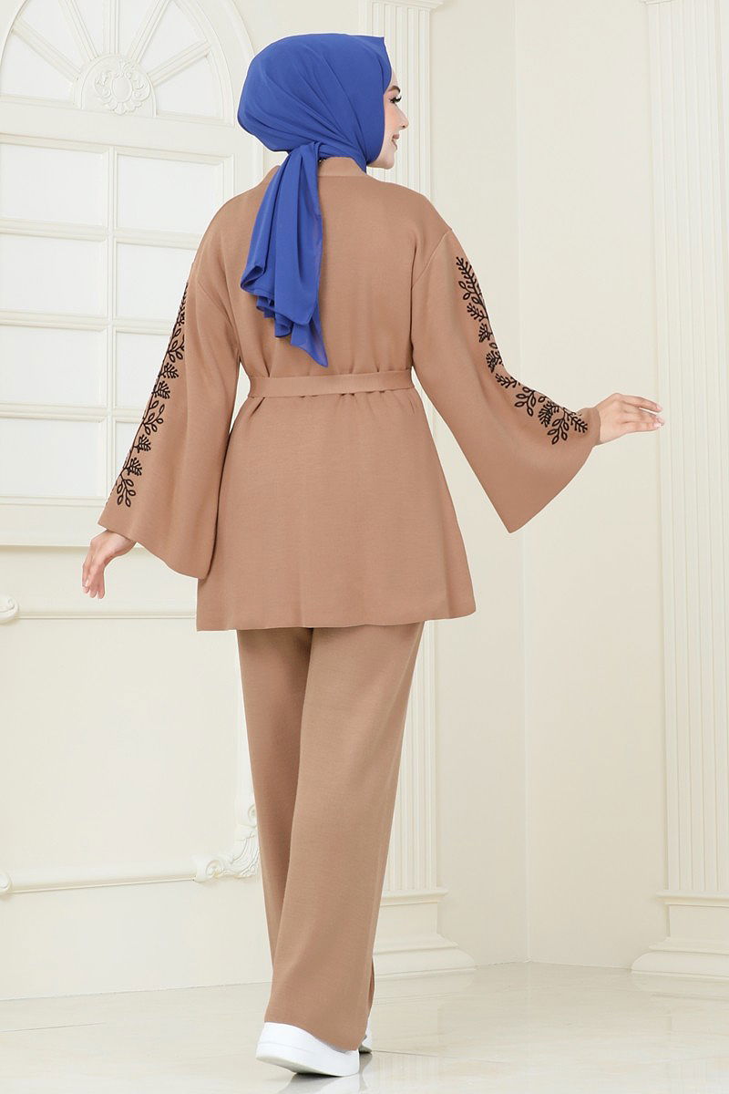 المنتج لديه ياقة السترة. غير مبطنة.. يتم خياطة تفاصيل التطريز. الحزام متضمن، ،يمكن استخدامها حسب الرغبة خصر البنطال مرن. قد يكون هناك اختلاف في الدرجة اللونية في المنتج بسبب التقاط الصور الفوتوغرافية.