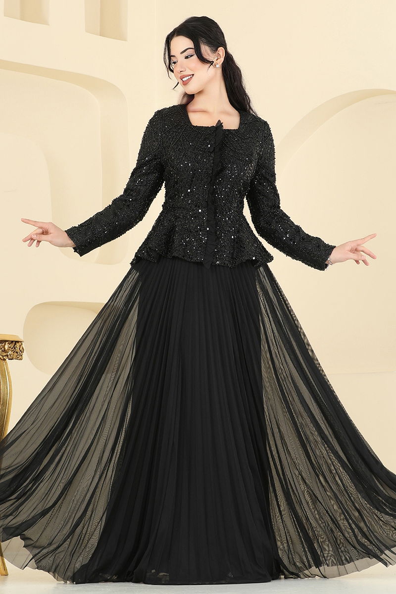 Emanating elegance with its chic details, the Sequin Detail Evening Set is suitable for all-season use. This KOMBİN model, fitting for modest fashion, is crafted from chiffon and sequined fabric and features a square neckline. The product is lined, and the sequins are securely sewn. It includes a convenient zipper at the waist of the skirt. Dry cleaning is recommended. The product displayed is size 38. This exquisite design will offer you elegance and comfort on your special days.