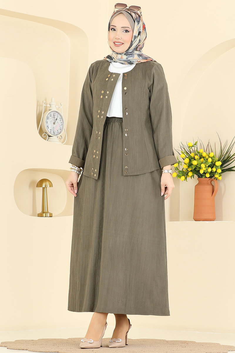 If you're looking for a modern and stylish hijab outfit, the Metal Button Detailed Suit is just for you! Suitable for all seasons, this set can be washed at 30 degrees under gentle conditions. Made from diagonal fabric, it offers practical use with its biker neck and front buttons. The unlined structure provides lightness, while the active snap details and elasticated waist of the skirt prioritize comfort. Showcasing an example with size 38 on the model, it offers a captivating style suitable for every size. Comprising a blouse and skirt, you can choose this set for everyday use to special occasions.