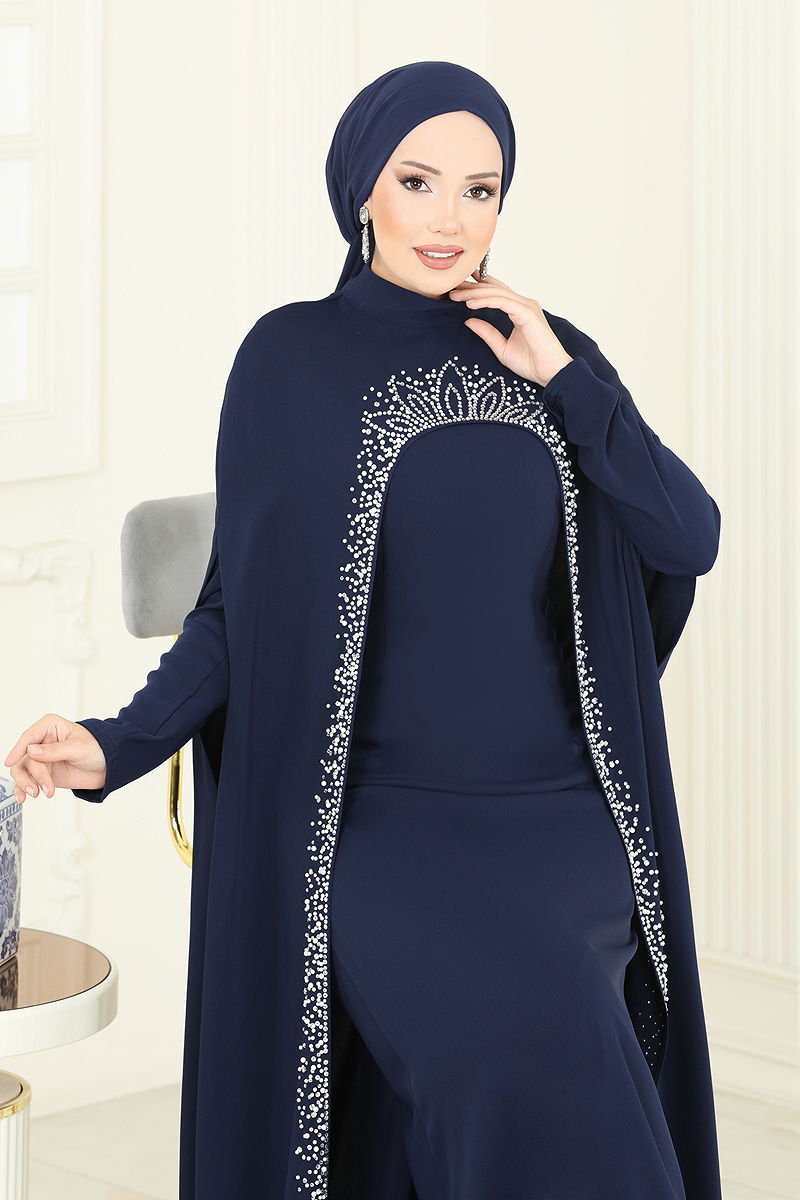 This elegant Stone Embellished Abaya Evening Set is a perfect choice for your special occasions. Suitable for all seasons, this set is made of imported crepe fabric and designed with a demi-high collar. The product should only be dry cleaned, lined and has a back zipper for easy dressing. Adorned with pearl details and adhesive stones, it has a zippered waist on the skirt. Offering both style and comfort, this set will become an indispensable part of your wardrobe.