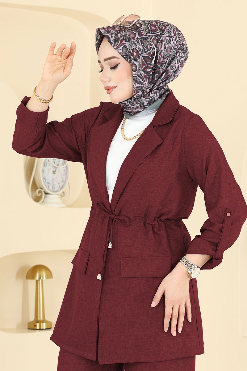 The Apolet Detailed Sofia Suit KOMBİN model is a stylish and functional modest wear. Made from linen, this suit can be comfortably worn in all seasons. The jacket is unlined for comfort, while the pants have an elastic waist for added convenience. The pocket detail on both the jacket and pants adds a touch of elegance, while the active shoulder strap buttons on the cuffs are chic. The product can be washed gently at 30 degrees.