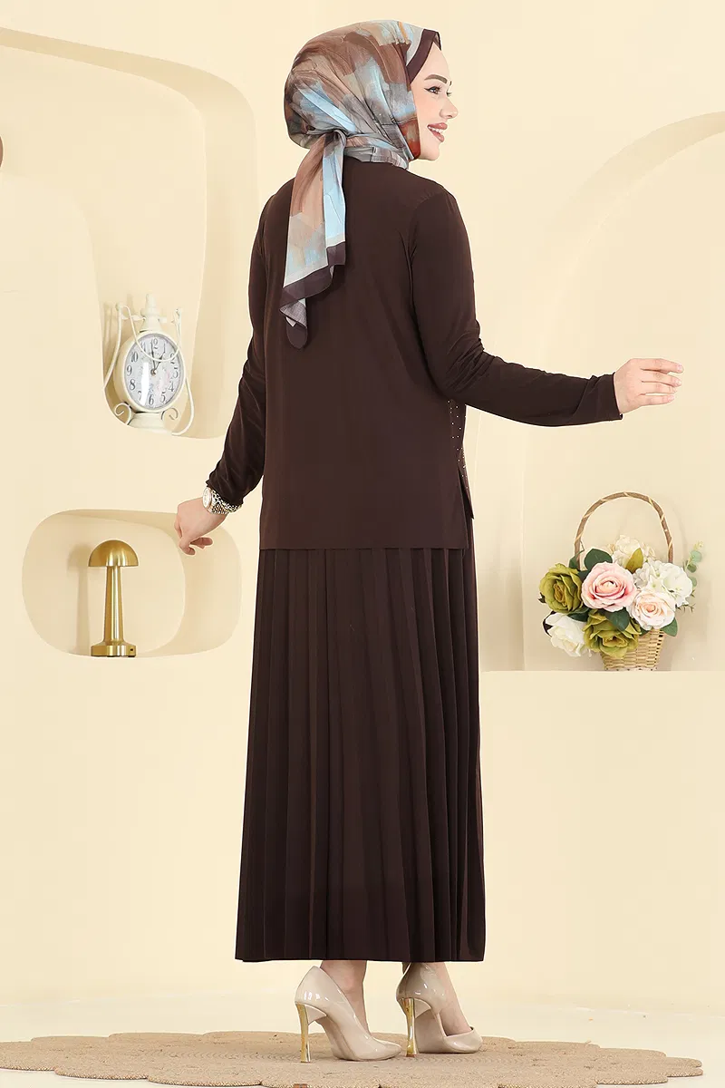 The Stone-Detailed Pleated Skirt Set is an ideal choice for those who embrace elegant modest fashion. Suitable for all seasons, this item stands out with the durability and breathability of sandy fabric. The blouse, adorned with stone details, adds a modern touch with its bicycle neckline while the pleated skirt offers a graceful and feminine silhouette. It can be washed gently at 30 degrees.