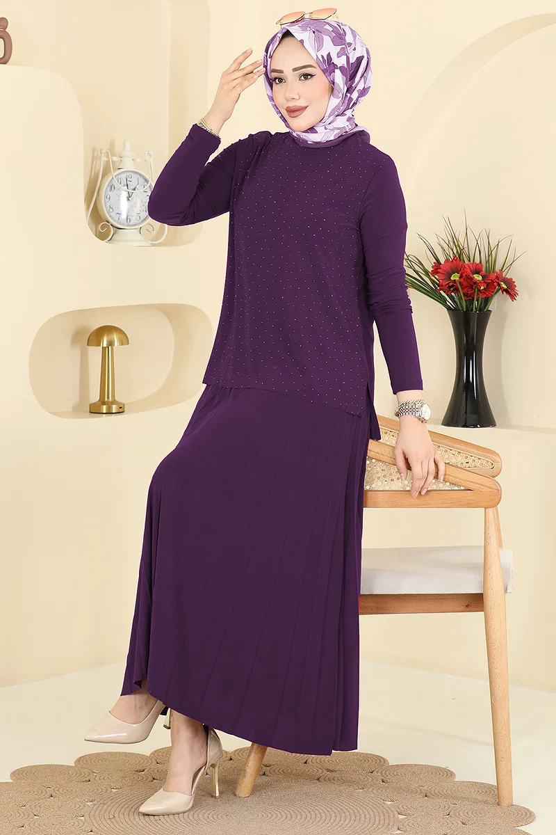 The Stone-Detailed Pleated Skirt Set is an ideal choice for those who embrace elegant modest fashion. Suitable for all seasons, this item stands out with the durability and breathability of sandy fabric. The blouse, adorned with stone details, adds a modern touch with its bicycle neckline while the pleated skirt offers a graceful and feminine silhouette. It can be washed gently at 30 degrees.