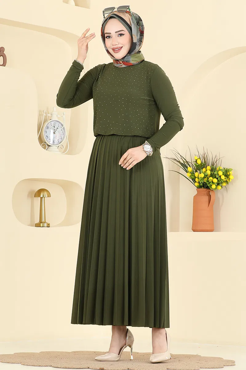 The Stone-Detailed Pleated Skirt Set is an ideal choice for those who embrace elegant modest fashion. Suitable for all seasons, this item stands out with the durability and breathability of sandy fabric. The blouse, adorned with stone details, adds a modern touch with its bicycle neckline while the pleated skirt offers a graceful and feminine silhouette. It can be washed gently at 30 degrees.