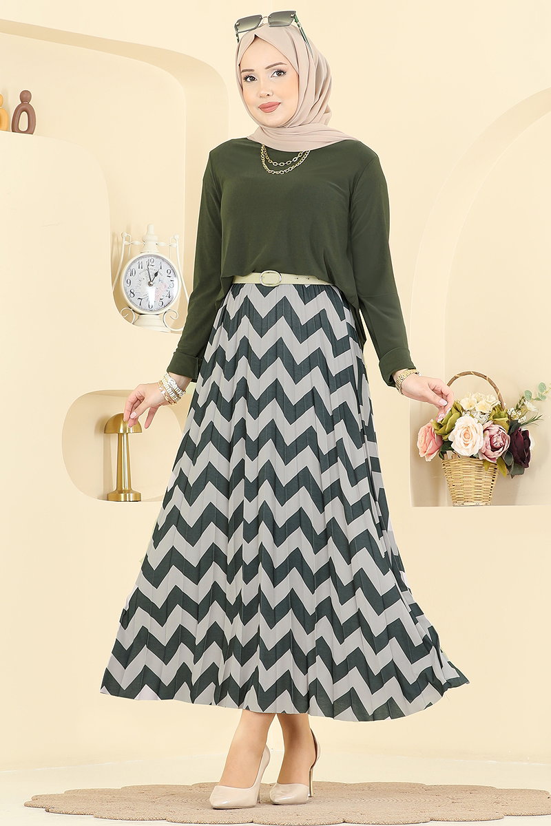 المنتج لديه ياقة دائرية. البلوز تحتوي على فتحة. .خصر التنورة مرن قد يكون هناك اختلاف في الدرجة اللونية في المنتج بسبب التقاط الصور الفوتوغرافية.
