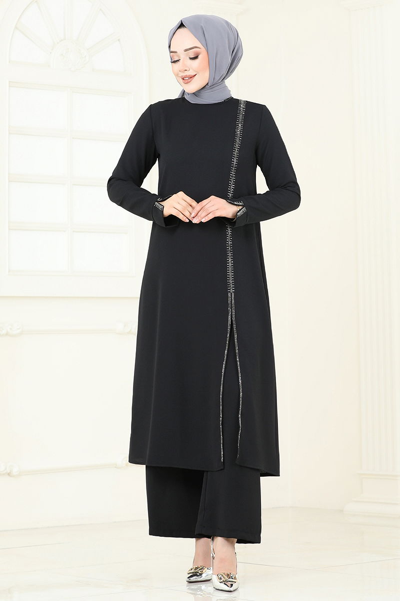 المنتج لديه ياقة بيضوية. البلوز تحتوي على فتحة. غير مبطنة. المنتج به سحاب في جزء من الخلف. يتم لصق الحجارة. خصر البنطال مرن. السوار مطاطي. قد يكون هناك اختلاف في الدرجة اللونية في المنتج بسبب التقاط الصور الفوتوغرافية.
