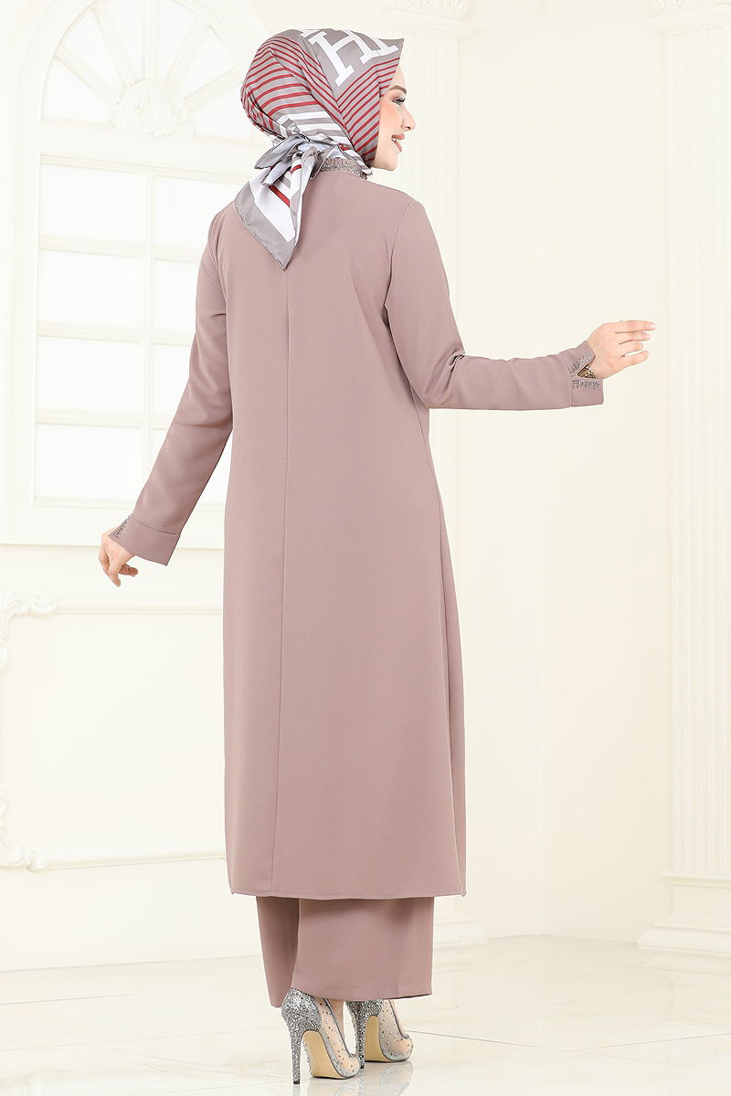Product Feature : It is a new season hijab fashion product. The product has a Judge collar. The tunic has a side slash.. Unlined. The product has a zipper at the from the back part. The stones are glued. The waist of the trousers is elastic. The cuff is rubberized. There may be a tonal difference in the product due to concept photo shoots.