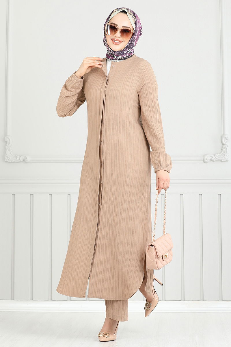 Product Name: Hidden Button Twin Set. This model is a modest wear suit, which can comfortably be used in all four seasons. It can be washed in a gentle cycle at 30 degrees Celsius. Made from tree bark fabric, it is durable and comfortable. The bicycle neck and hidden button design offer a modern and stylish look. The tunic has side slits and is unlined, while the pants have an elastic waist for added comfort. The product displayed is in size 38. It allows you to maintain your elegance in any season.