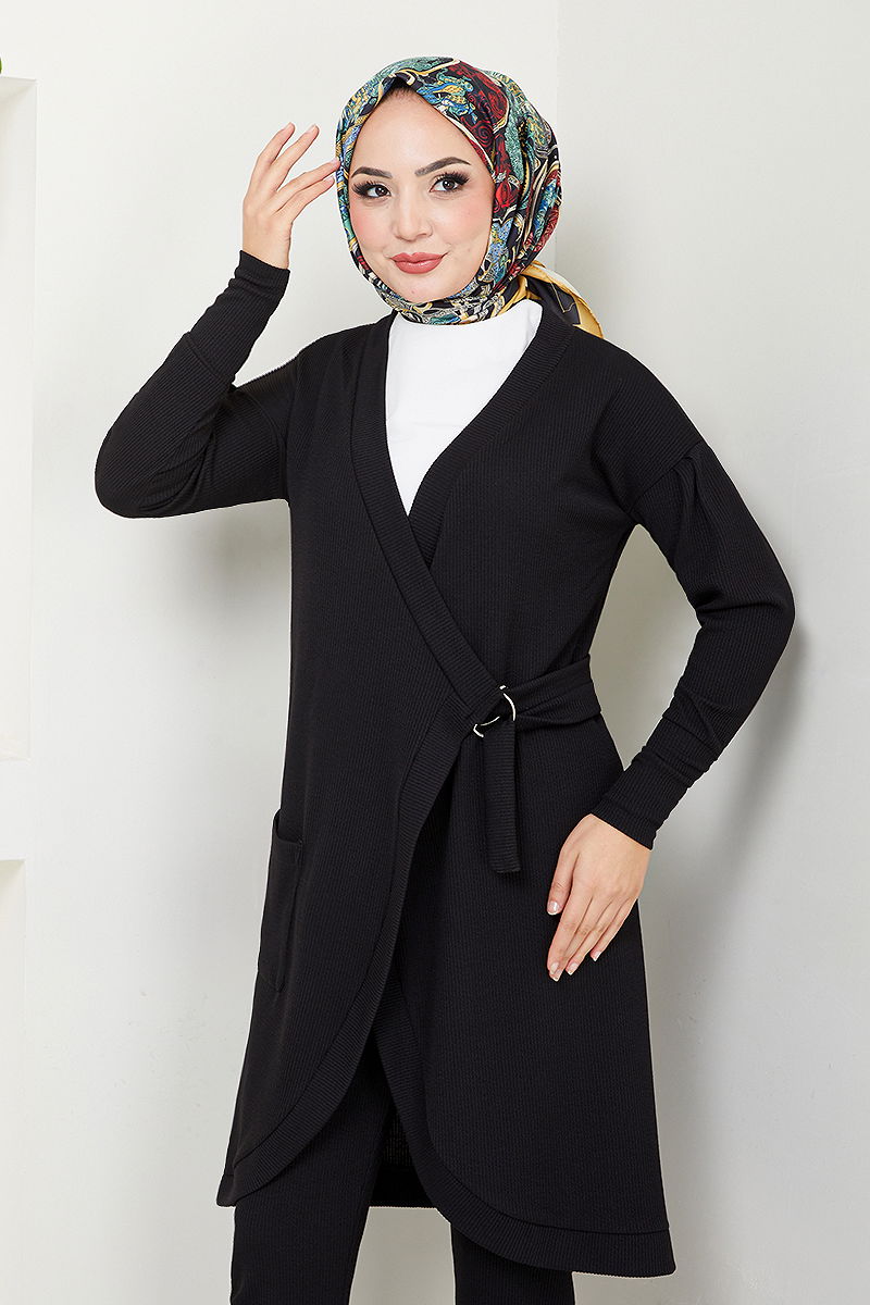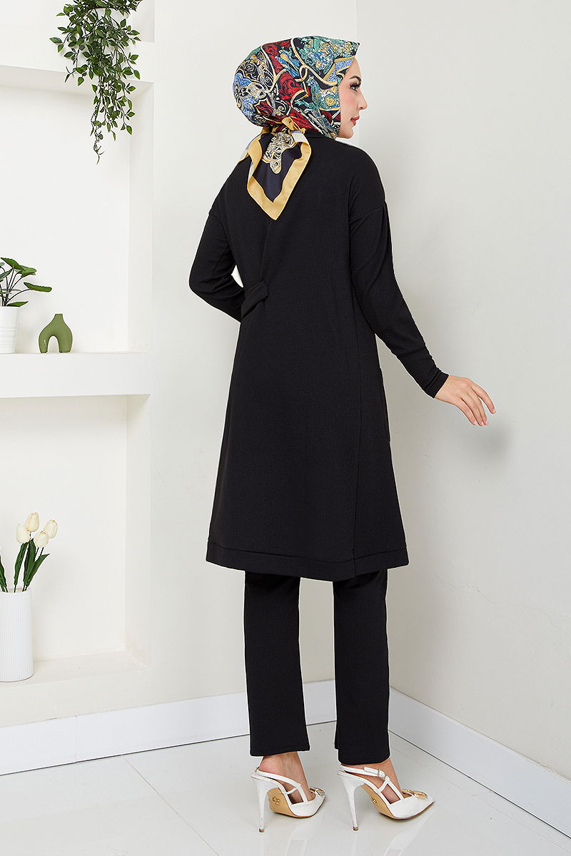 Side-Tied Two-Piece KOMBIN model hijab outfit. Suitable for the winter season. Should be washed at 30 degrees without squeezing. Made of first-class Burgu fabric. Unlined. (The product on the model is one size.) Features a stitched belt and elastic waistband on the trousers. TUNIC and TROUSERS