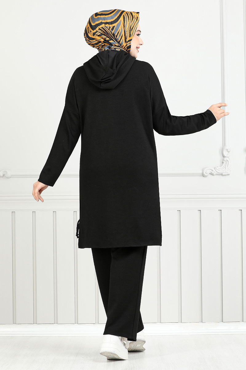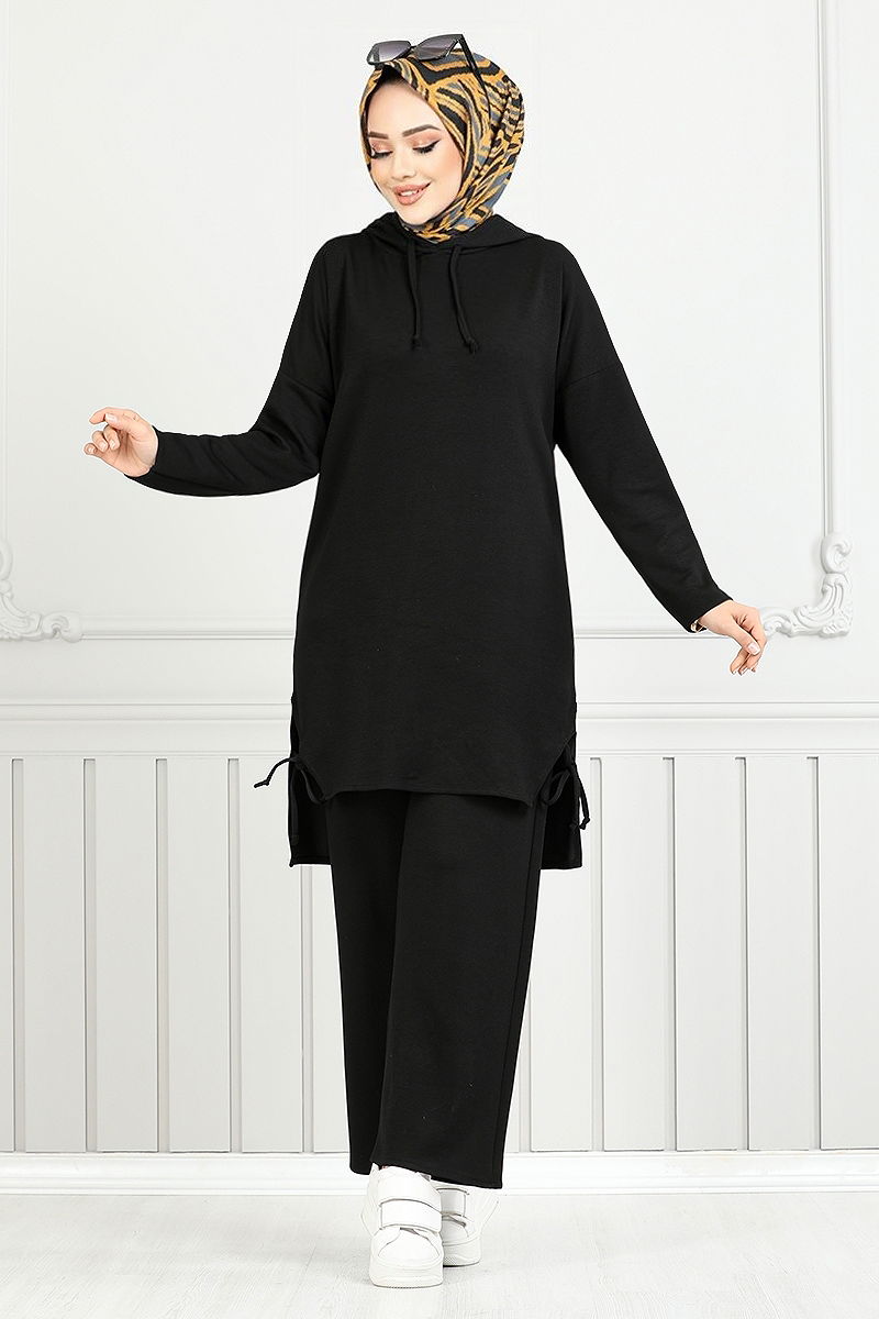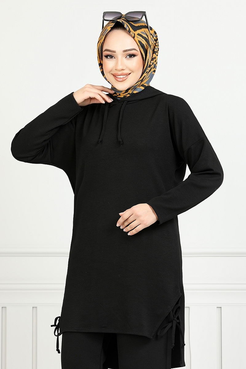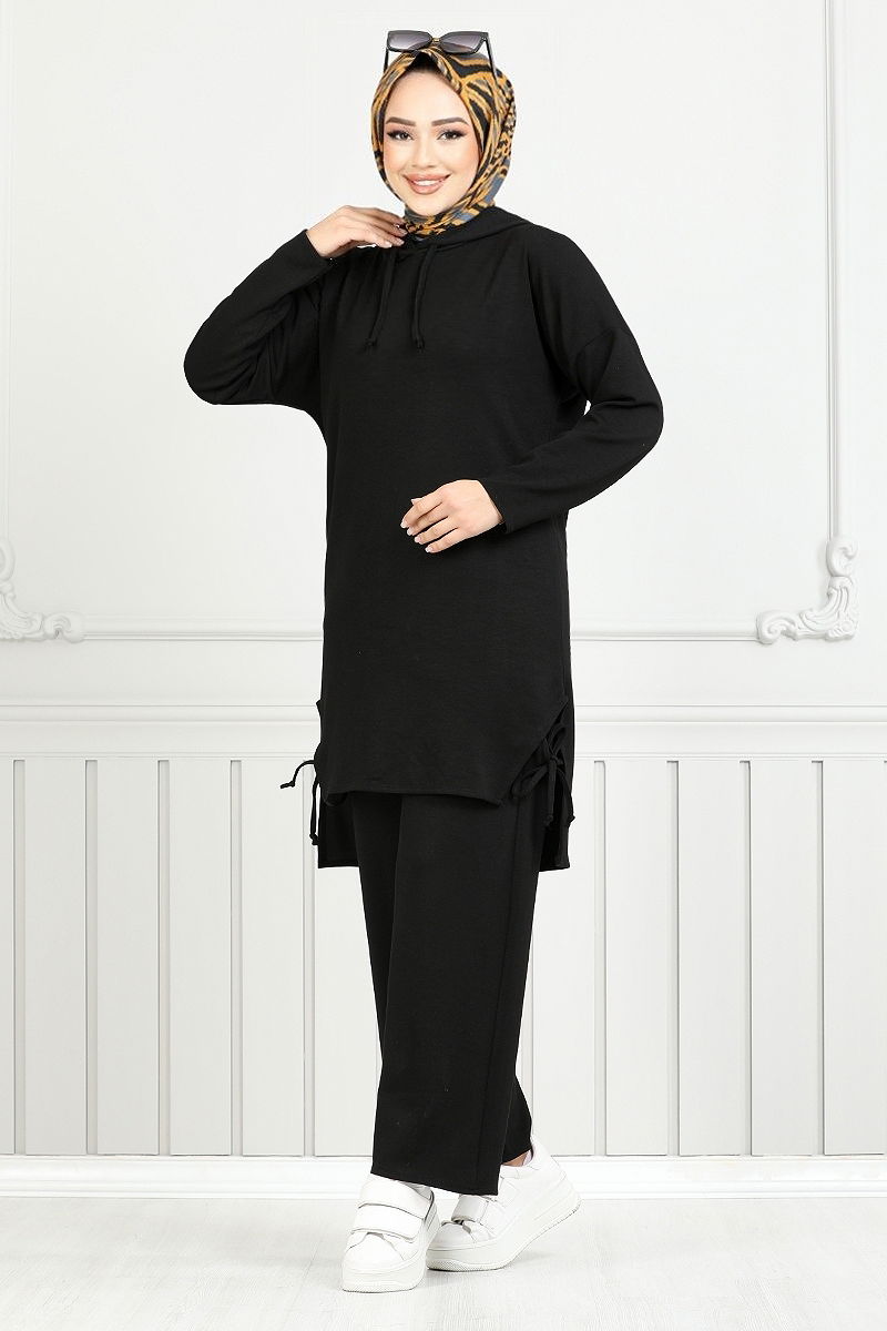 البلوزة مربوطة من الجانب. المنتج لديه ياقة مع قبعة. غير مبطنة. تم خياطة القبعة مع المنتج يحتوي المنتج على جيب. خصر البنطال مرن. قد يكون هناك اختلاف في الدرجة اللونية في المنتج بسبب التقاط الصور الفوتوغرافية.