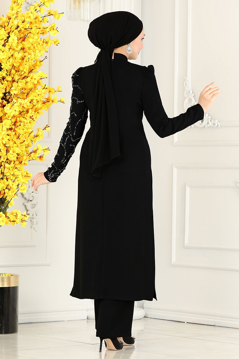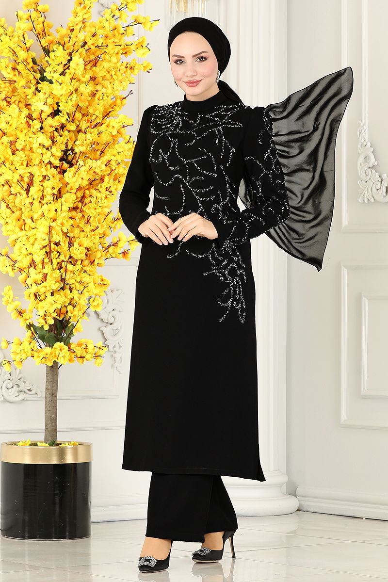 المنتج لديه ياقة نصف بيضوية. البلوز تحتوي على فتحة. غير مبطنة.. المنتج به سحاب في جزء من الخلف. يتم لصق الحجارة. خصر البنطال مرن. قد يكون هناك اختلاف في الدرجة اللونية في المنتج بسبب التقاط الصور الفوتوغرافية.