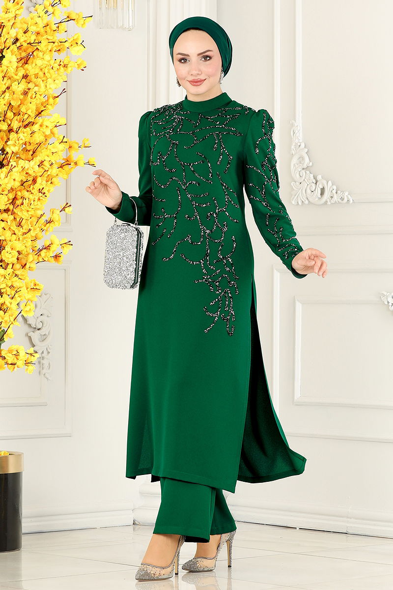 المنتج لديه ياقة نصف بيضوية. البلوز تحتوي على فتحة. غير مبطنة.. المنتج به سحاب في جزء من الخلف. يتم لصق الحجارة. خصر البنطال مرن. قد يكون هناك اختلاف في الدرجة اللونية في المنتج بسبب التقاط الصور الفوتوغرافية.