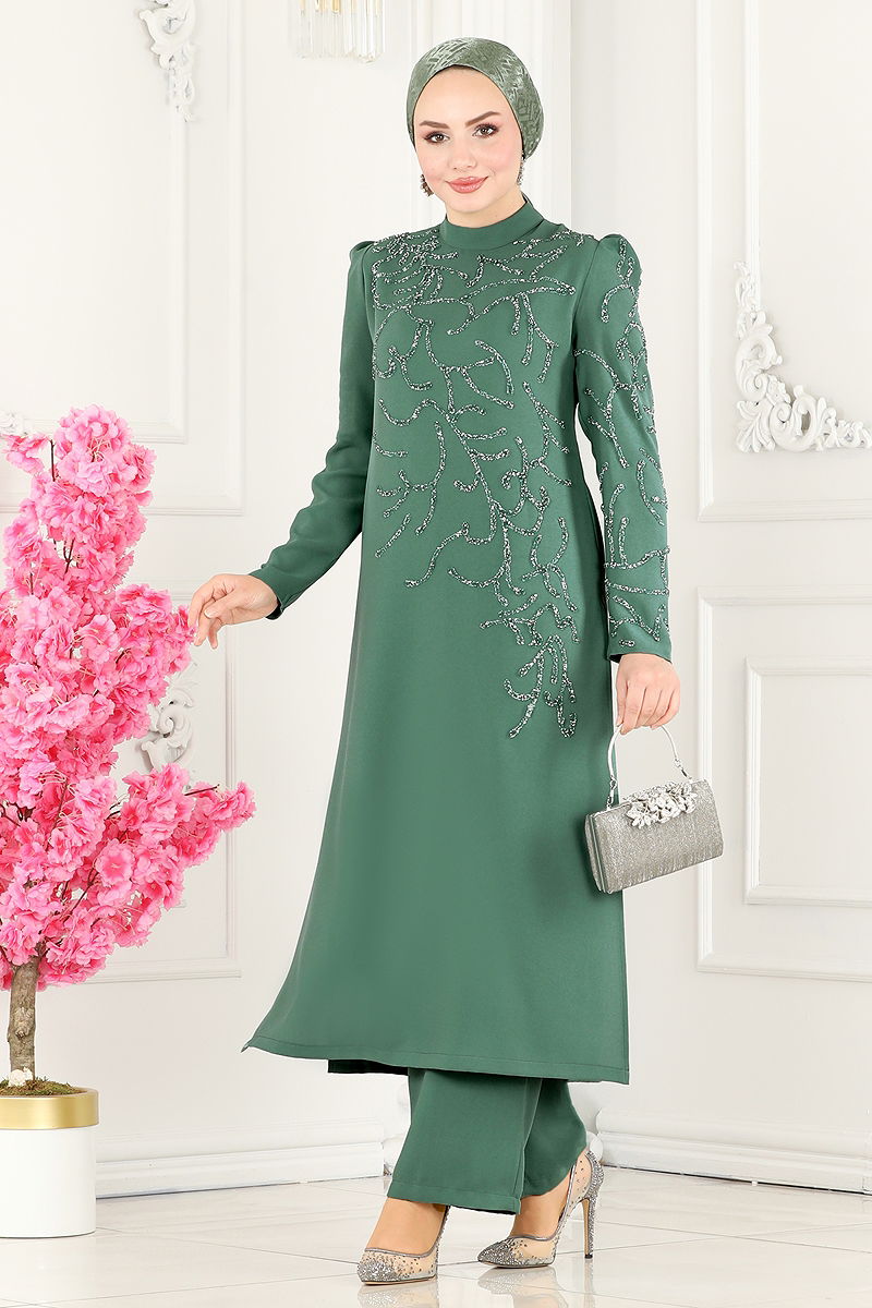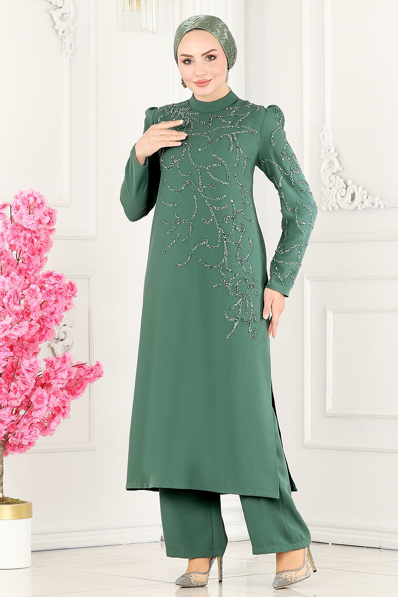 Product Feature : It is a new season hijab fashion product. The product has a Half Judge collar. The tunic has a side slash.. Unlined.. The product has a zipper at the from the back part. The stones are glued. The waist of the trousers is elastic. There may be a tonal difference in the product due to concept photo shoots.