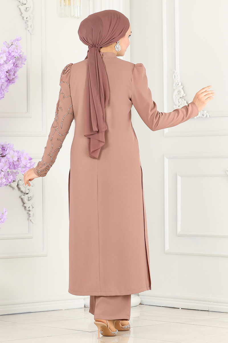 المنتج لديه ياقة نصف بيضوية. البلوز تحتوي على فتحة. غير مبطنة.. المنتج به سحاب في جزء من الخلف. يتم لصق الحجارة. خصر البنطال مرن. قد يكون هناك اختلاف في الدرجة اللونية في المنتج بسبب التقاط الصور الفوتوغرافية.