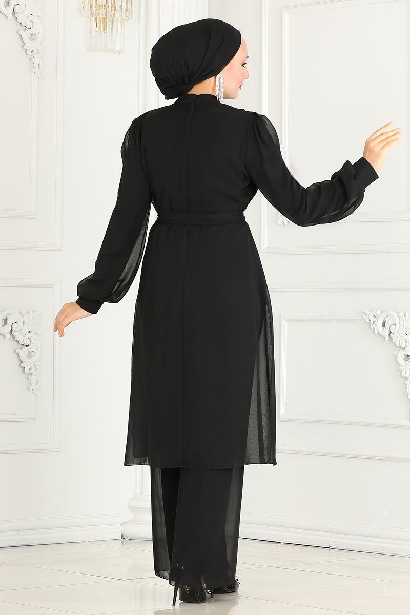 المنتج لديه ياقة نصف بيضوية. مبطنة.. يتم لصق الحجارة. الحزام متضمن، ،يمكن استخدامها حسب الرغبة خصر البنطال مرن. أزرار الكفة نشطة. قد يكون هناك اختلاف في الدرجة اللونية في المنتج بسبب التقاط الصور الفوتوغرافية.