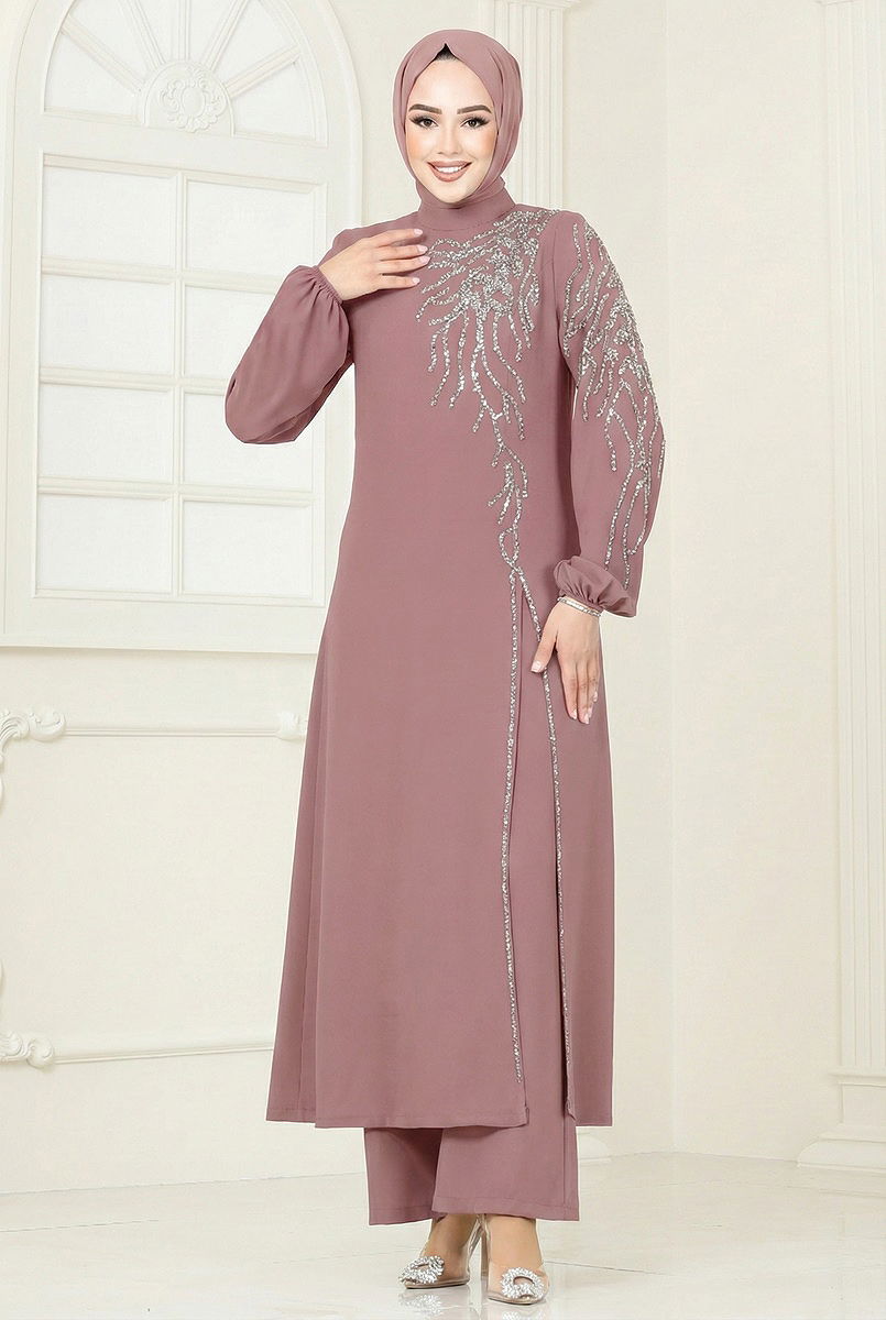 Product Feature : It is a new season hijab fashion product. It has a zipper that can be used from the back. The product has a Half Judge collar. The tunic has a front slash.. Unlined.. The product has a zipper at the From the back part. The stones are glued. The waist of the trousers is elastic. The cuff is rubberized. There may be a tonal difference in the product due to concept photo shoots.