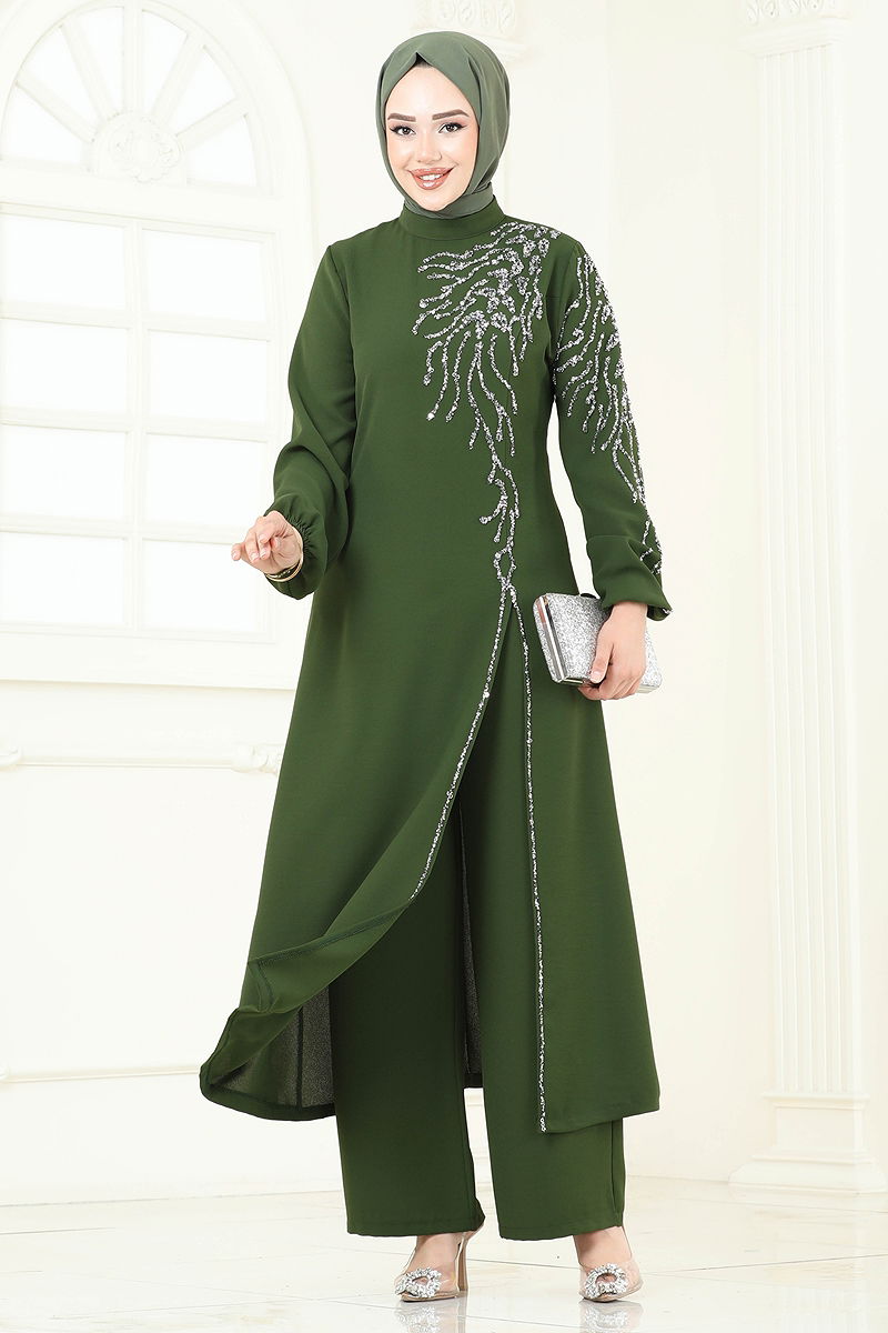 يوجد سحاب للإغلاق في الخلف. المنتج لديه ياقة نصف بيضوية. البلوز تحتوي على فتحة. غير مبطنة.. المنتج به سحاب في جزء من الخلف. يتم لصق الحجارة. خصر البنطال مرن. السوار مطاطي. قد يكون هناك اختلاف في الدرجة اللونية في المنتج بسبب التقاط الصور الفوتوغرافية.