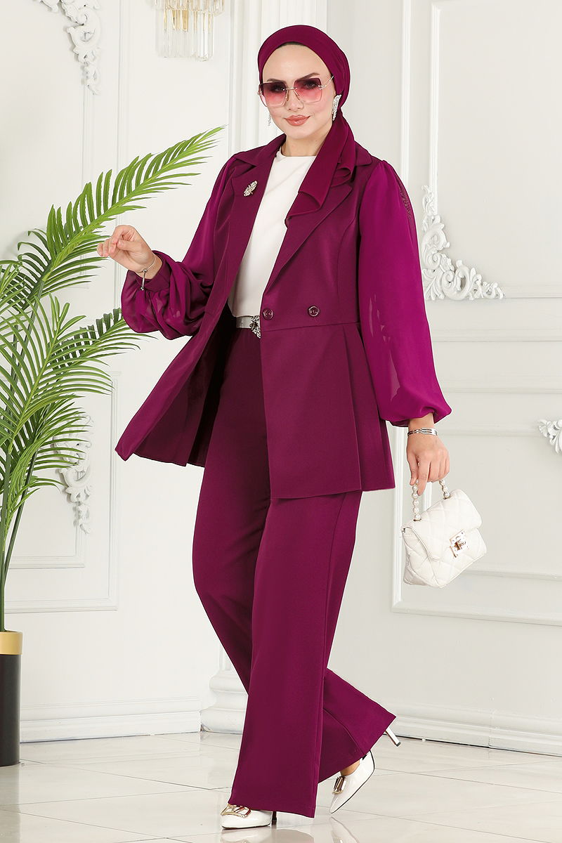 ميزة المنتج: إنه منتج أزياء حجاب للموسم الجديد. المنتج عبارة عن ياقة سترة. المنتج به أزرار أمامية. غير مبطنة. خصر البنطلون مطاطي. قد يكون هناك اختلاف في درجة اللون في المنتج بسبب التصوير الفوتوغرافي.