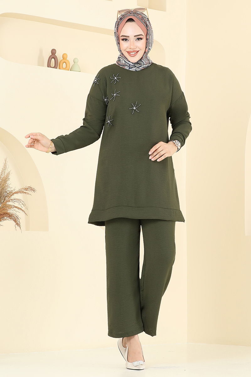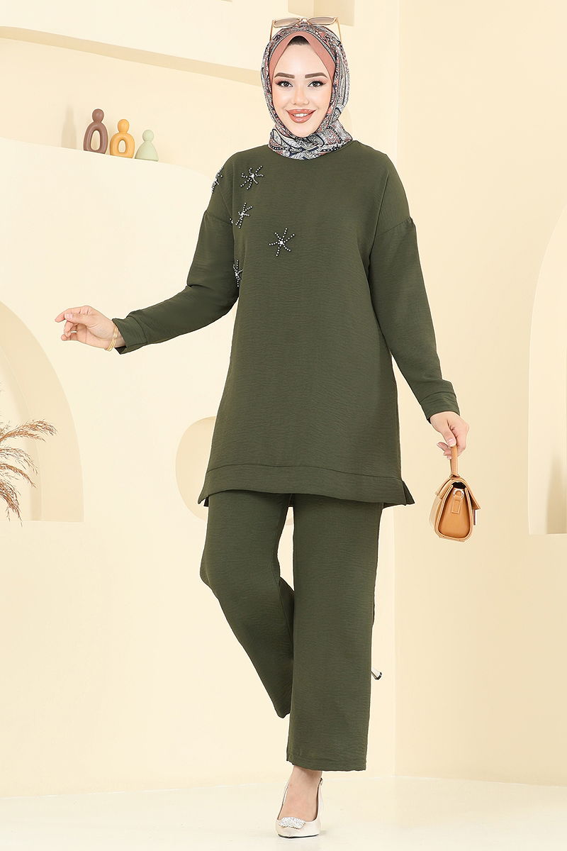 This elegant and chic Beaded Hijab Suit is perfect for maintaining your comfort and style throughout the four seasons. Made from aerobin fabric, the suit is easy to care for with its machine washable at 30 degrees feature on gentle cycle. Comprising a tunic and pants, this outfit offers a bicycle neckline and an unlined structure for comfortable wear. The elastic waist of the pants ensures comfort all day long, while the beaded details complete your elegance. The product is available in sizes 38-40 and is a perfect choice for all your special occasions.
