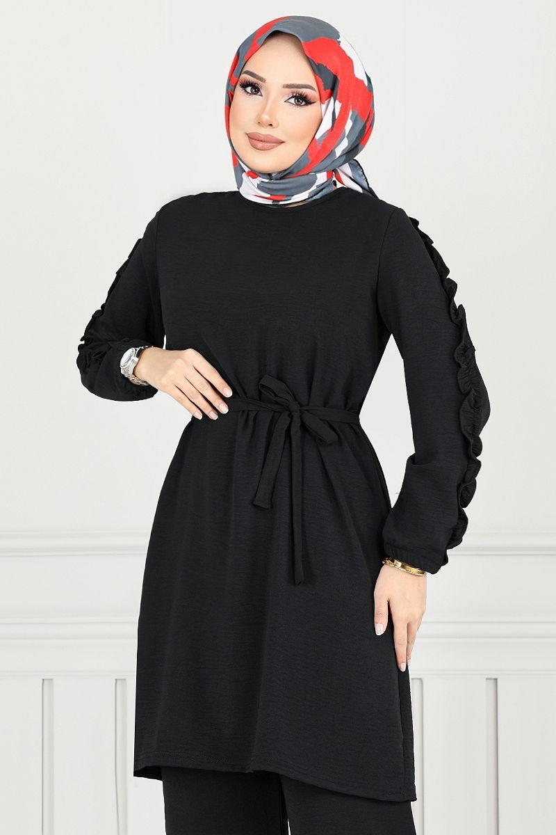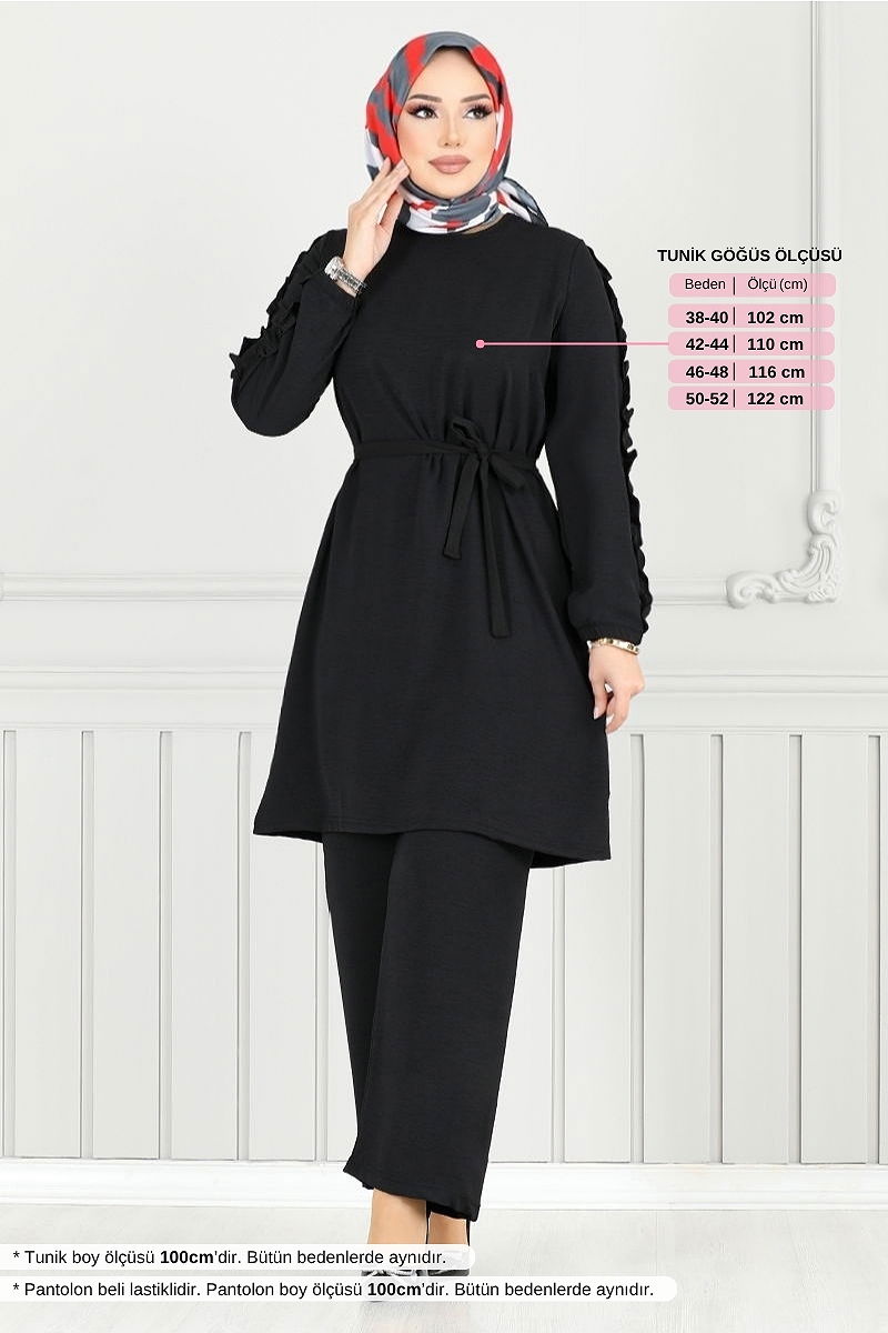 Our Ruffle Sleeve Aerobin Suit COMBINE model is designed with your comfort in mind for all seasons. This modest wear can be washed at 30 degrees on a gentle cycle and provides comfort all day with its lightweight aerobin fabric. The suit features a crew neck and is unlined, adding an extra touch of elegance. It includes a head entry design for ease of wearing. The belt, designed to prevent waving, has stitched ends for practicality. The elastic waistband on the pants and elastic cuffs on the tunic ensure a perfect fit. Enjoy both aesthetics and comfort throughout the day with this chic combination.