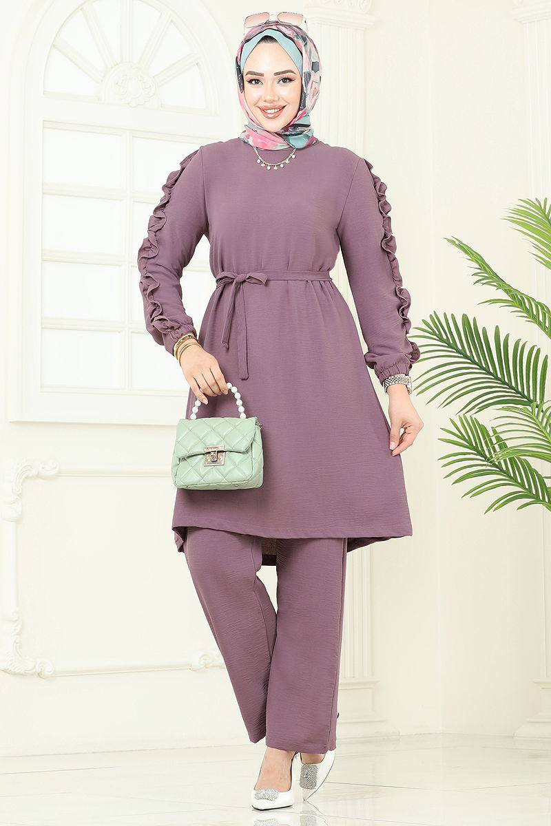 المنتج لديه ياقة دائرية. لا يوجد فتحات. غير مبطنة. الحزام متضمن، ،يمكن استخدامها حسب الرغبة خصر البنطال مرن. السوار مطاطي. قد يكون هناك اختلاف في الدرجة اللونية في المنتج بسبب التقاط الصور الفوتوغرافية.