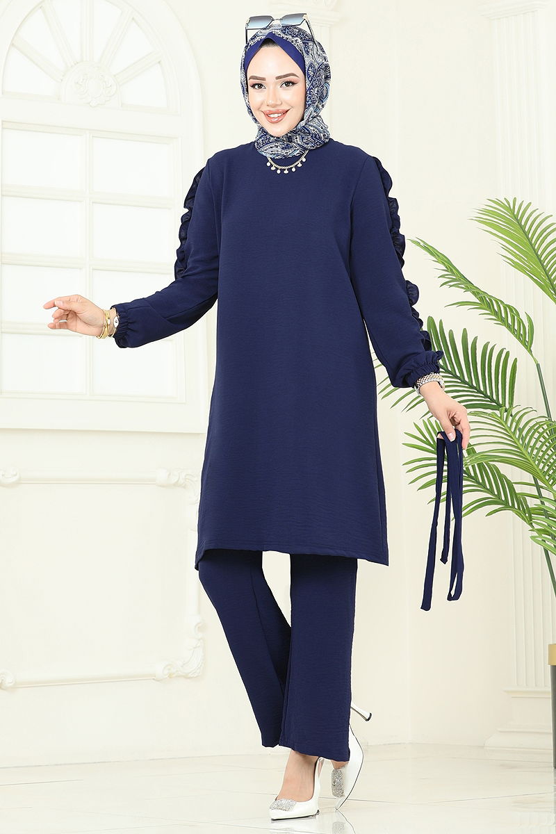 The latest fashion and comfort combined, the Ruffled Sleeve Hijab Set offers a chic combination that can be comfortably worn in all seasons. Made from aerobin fabric, it provides a light and comfortable wear. With its bicycle neckline and unlined design, it offers a modern look while the ruffled sleeves bring elegance to the forefront. The elastic waistband and cuffs ensure a perfect fit. Suitable for both everyday wear and special occasions, this set can be worn with or without the included belt.