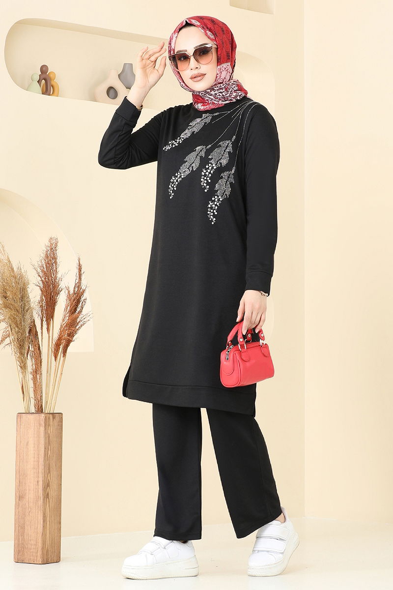 The Stone Detailed Hijab Suit is a symbol of elegant and comfortable dressing, suitable for use in all seasons with its unique design. Despite its delicate nature, this suit can be washed at 30 degrees and is made of dual-thread fabric, highlighting its durability. The bicycle collar tunic and side slit details provide a modern look, while the elasticated waist of the pants offers comfort all day long. The stone details add an extra touch of elegance. Together with the tunic and pants, you can create an eye-catching outfit for any setting.