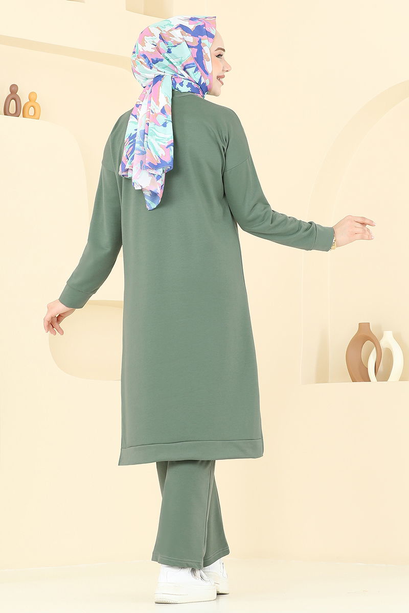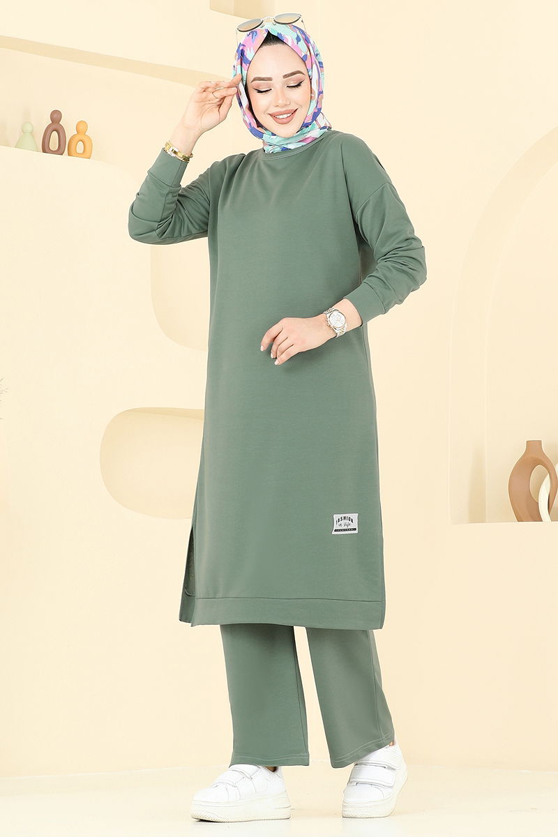 The Detail Two Piece Suit is designed for modest wear, suitable for all seasons. This product, which can be washed at 30 degrees with gentle care, is made from double-thread fabric. Featuring a crew neckline and side slits on the tunic, it offers a modern and stylish look. The sewn-in armor details are eye-catching, and the tunic is unlined. The pants have an elastic waistband for comfortable wear.