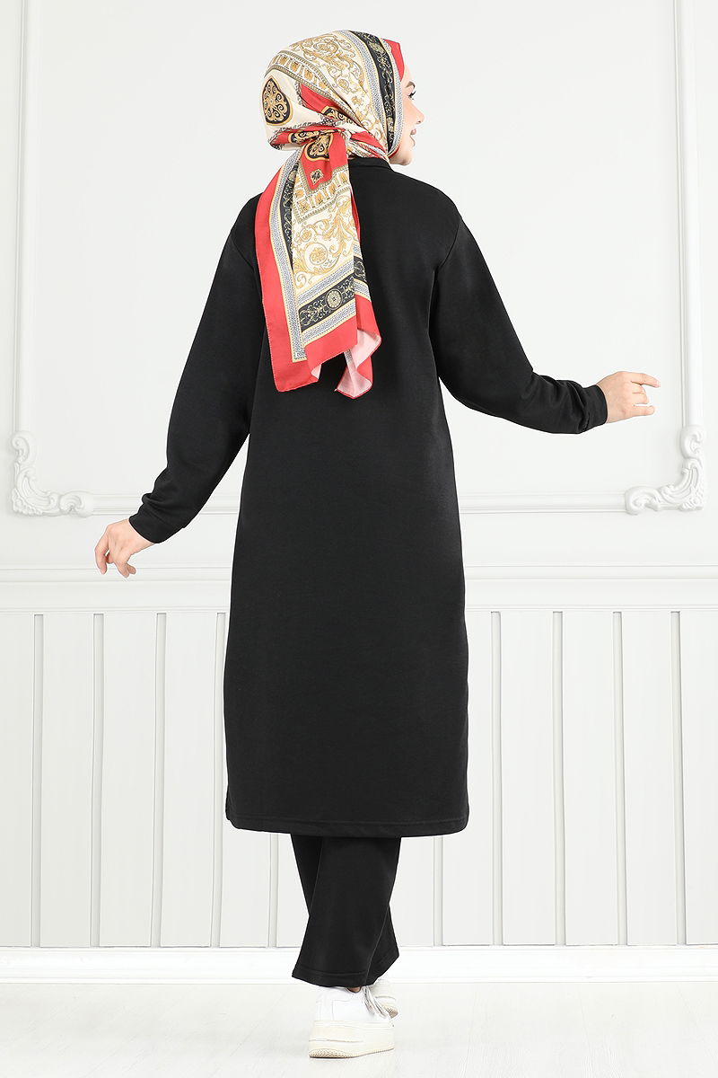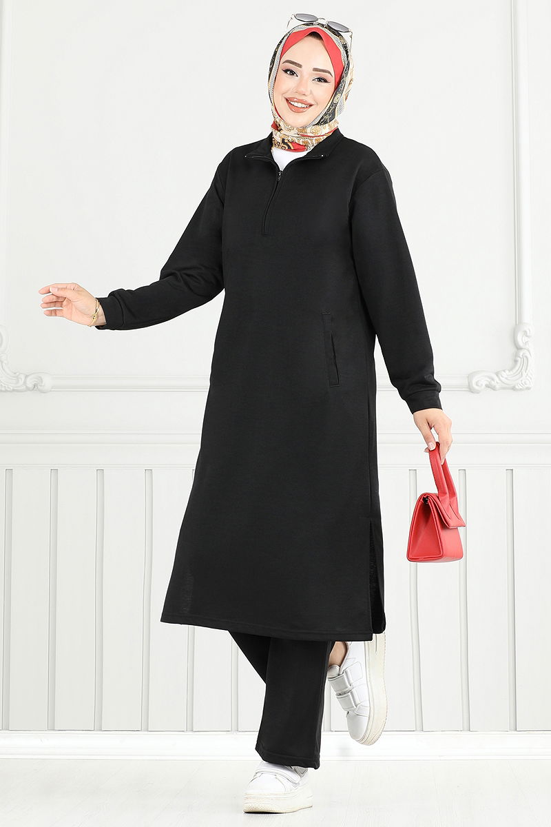 With its modern and elegant design, the Side Slit Hijab Suit is the ideal choice for comfort across all seasons. Made from dual-thread fabric, this suit is breathable and durable. It features a stand-up collar, side-slit tunic, and a front zipper that offers both style and comfort. The product shown is size 38-40. The pants have an elastic waist and pockets, providing extra comfort. Being unlined, this suit is lightweight and practical.