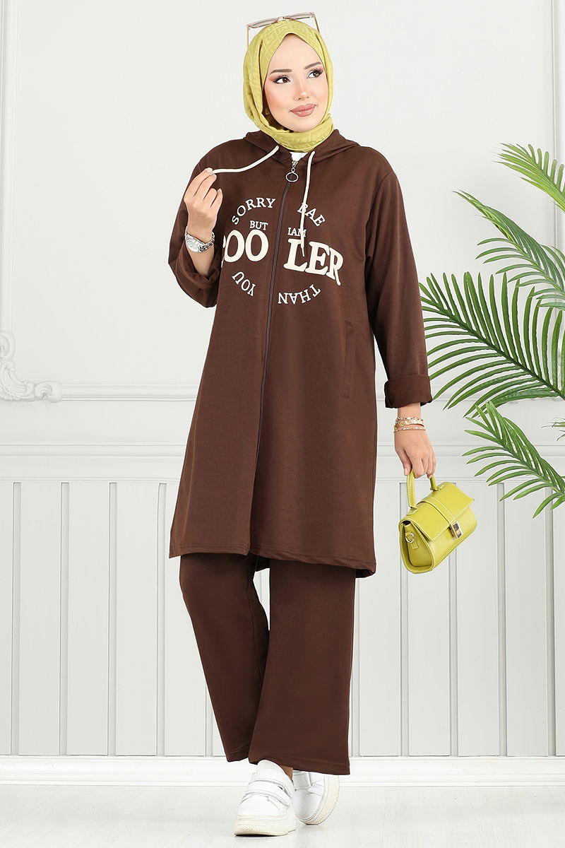 The Printed Text Sportswear Suit combine is a modern and functional modest sportswear suit that can be comfortably used in all four seasons. The suit is suitable for delicate washing at 30 degrees, and should be washed without wringing. Made from double thread fabric, this suit features a hooded and unlined design. There is a practical zipper at the front of the model. The texts are printed durably on the hood and the trousers. The trousers have an elastic waistband, and both the jacket and trousers come with practical pockets. This sportswear suit is perfect for bringing comfort and style together in your daily use.