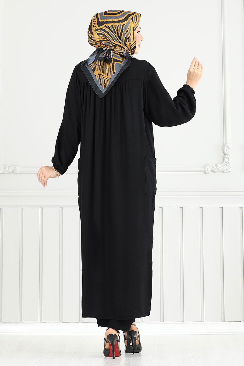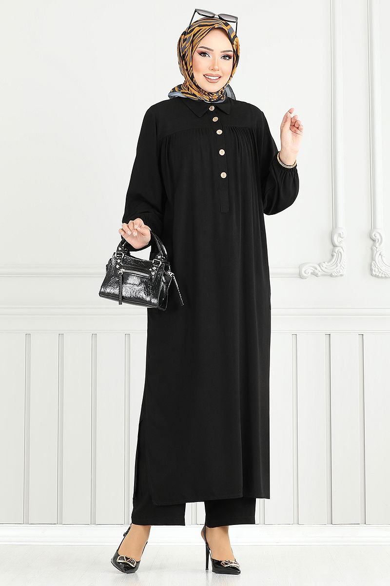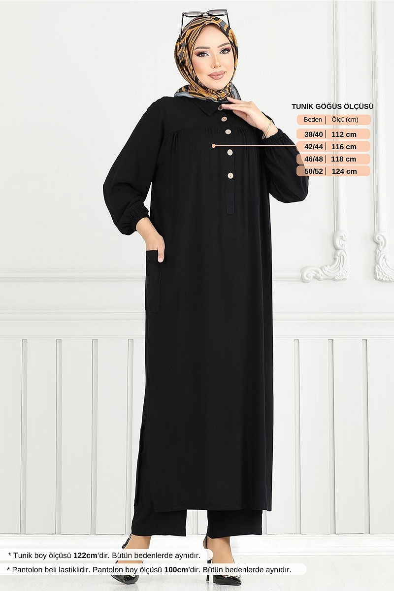 Elegant and comfortable, the Half-Buttoned Viscose Suit is suitable for all seasons. Made from viscose fabric, this modest wear set is durable and washable by hand. It features a shirt collar and half-button design at the front, offering freedom of movement with the side slit tunic. The waistband of the trousers is elastic, and there are practical pockets on both the tunic and trousers. With elastic cuffs, this set is perfect for those who want to stay comfortable without compromising on style.
