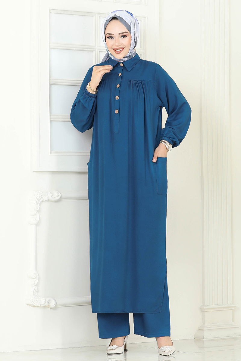 المنتج لديه ياقة القميص. المنتج به أزرار نصف أمامي. البلوز تحتوي على فتحة. غير مبطنة. يوجد جيب على البلوز خصر البنطال مرن. السوار مطاطي. قد يكون هناك اختلاف في الدرجة اللونية في المنتج بسبب التقاط الصور الفوتوغرافية.