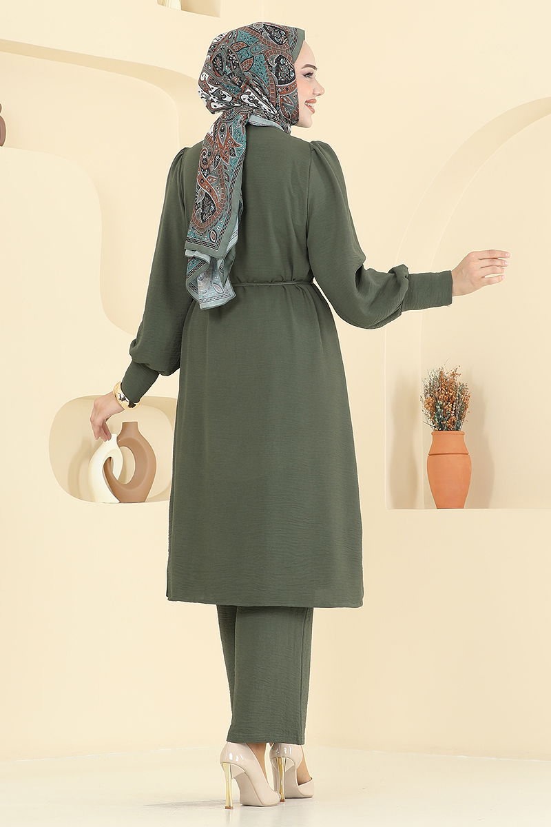 Product Feature : It is a new season hijab fashion product. The product has a Cycling collar. The product has From the front buttons. Unlined. Belt included, optional not available. The waist of the trousers is elastic. There may be a tonal difference in the product due to concept photo shoots.
