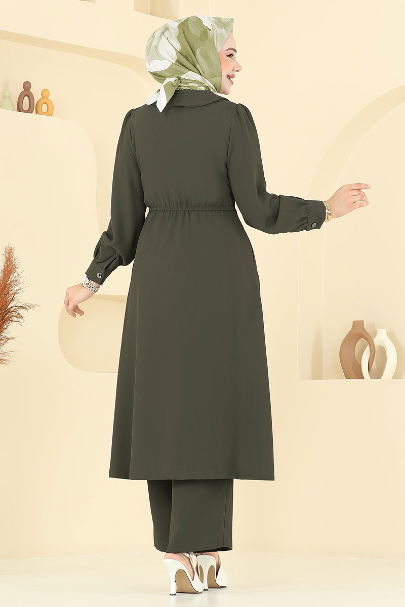 يوجد زر مزدوج يمكن استخدامه من الأمام. المنتج لديه ياقة مفتوحة. غير مبطنة. المنتج يحتوي على حزام خصر مُخاط. الملحقات غير متضمنة. البلوزة غير متضمنة. صُنعت عينة من المجموعة مع البلوزة لإظهار الاستخدام المقصود للمنتج. الجيب متاح. خصر البنطال مرن. أزرار الكفة نشطة. قد يكون هناك اختلاف في الدرجة اللونية في المنتج بسبب التقاط الصور الفوتوغرافية.