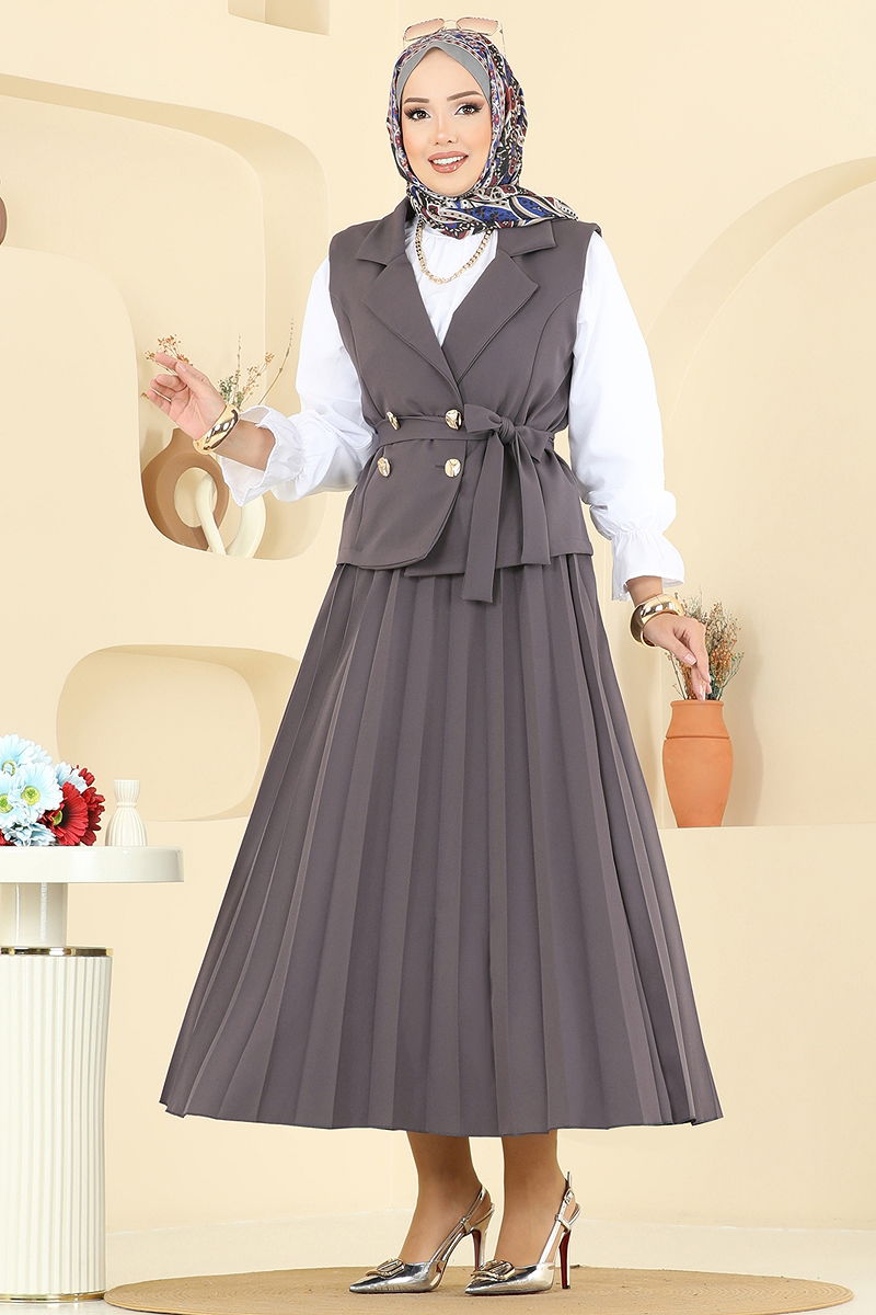 Designed for stylish women who appreciate fashion all year round, the Pleated Skirt Three-Piece COMBO is a must-have in the modest fashion scene. Made from durable Dabıl fabric, this set includes a front-buttoned jacket with a semi-standing collar and a pleated skirt with an elastic waistband. The unlined nature of the outfit ensures it is light and comfortable to wear. It features a back zipper for practicality and an optional belt at the waist, which can be worn or removed as desired. You can effortlessly flaunt the elegance of this combo from the office to special events.