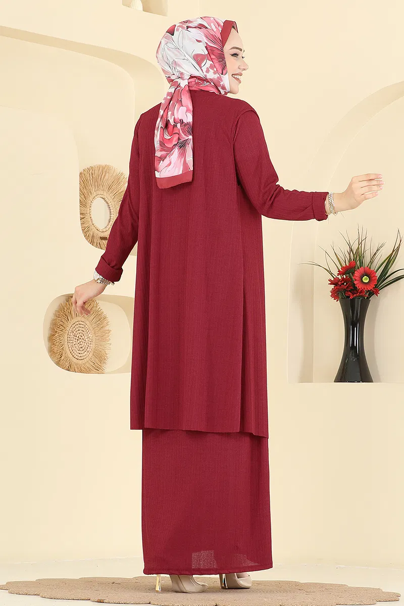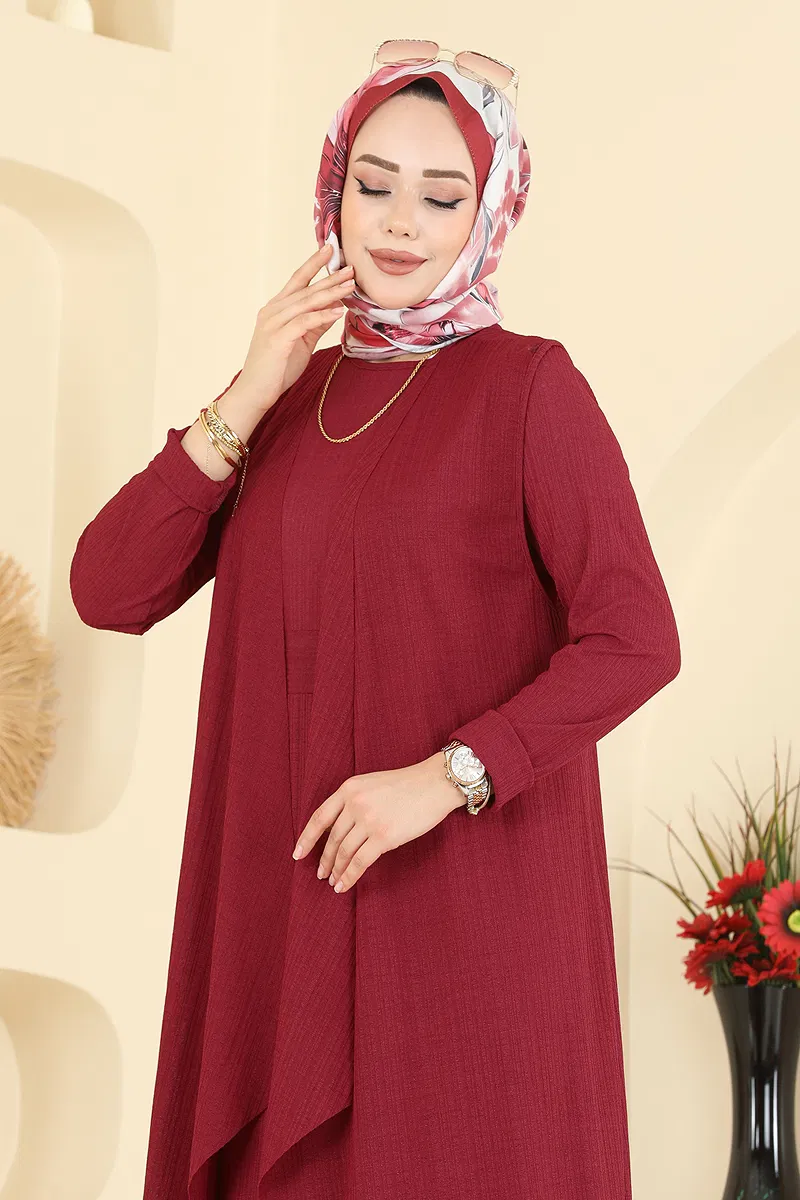 The Asymmetric Vest Knit Set is specially designed for the modest fashion style. Suitable for all seasons, this set can be comfortably worn any time of the year and is machine washable at 30 degrees on a gentle cycle. Featuring a crew neck and without lining, this product combines elegance with comfort. The dress has long sleeves and a seamed waist. This combination, which includes both a vest and a dress, is set to be an essential part of your wardrobe. The product on the model is size 40, but it is available in various sizes.