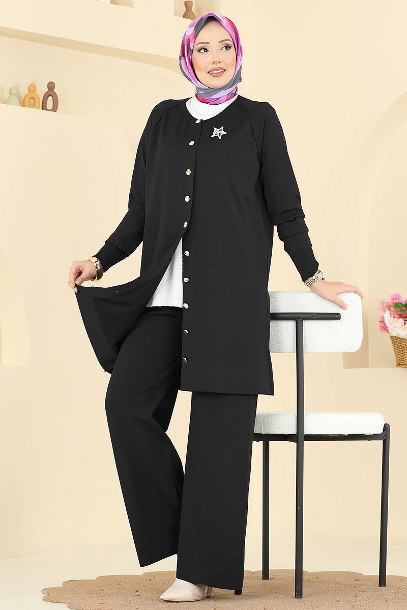 المنتج لديه ياقة دائرية. المنتج به أزرار من الأمام. غير مبطنة. يتم تضمين البروش،يمكن استخدامها حسب الرغبة خصر البنطال مرن. قد يكون هناك اختلاف في الدرجة اللونية في المنتج بسبب التقاط الصور الفوتوغرافية.