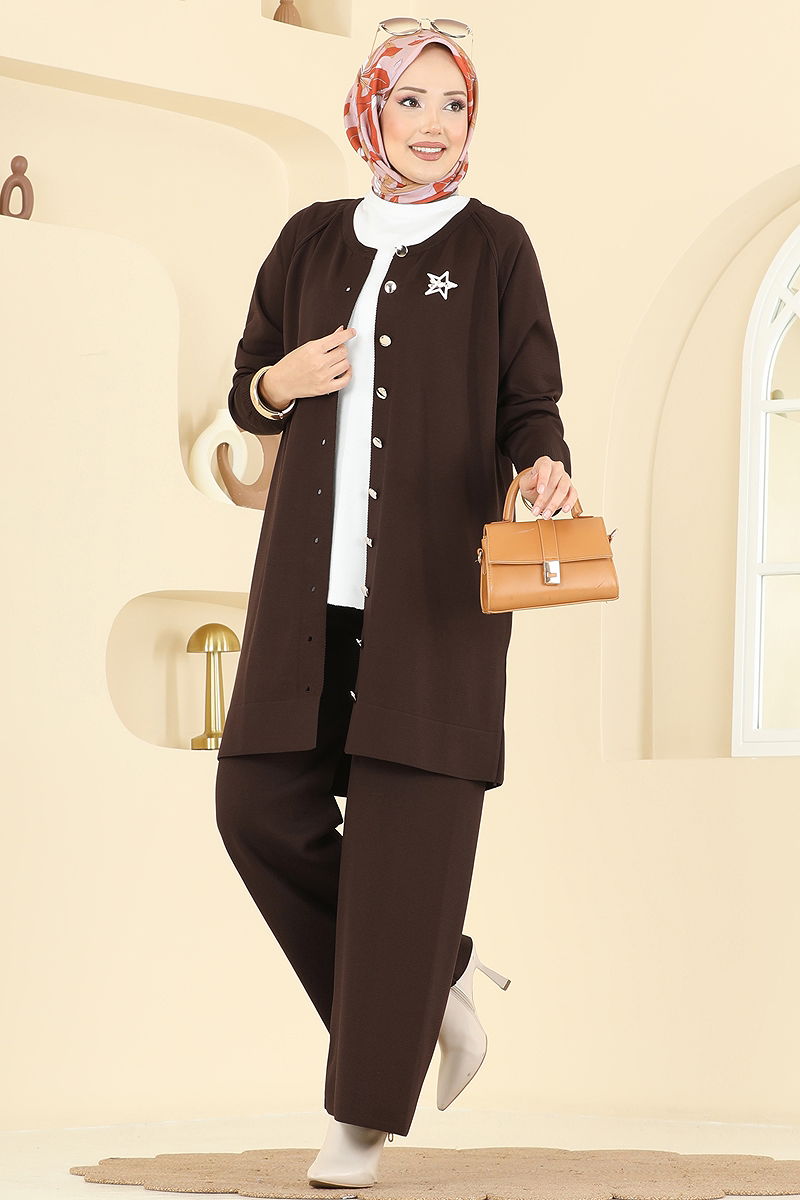 المنتج لديه ياقة دائرية. المنتج به أزرار من الأمام. غير مبطنة. يتم تضمين البروش،يمكن استخدامها حسب الرغبة خصر البنطال مرن. قد يكون هناك اختلاف في الدرجة اللونية في المنتج بسبب التقاط الصور الفوتوغرافية.
