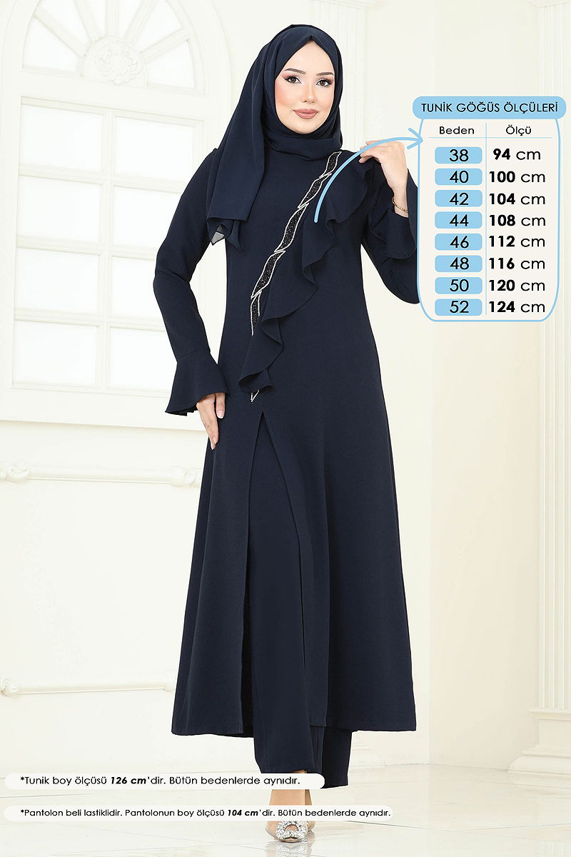 Product Feature : It is a new season hijab fashion product. The product has a Cycling collar. It has a slash.. Unlined. The product has a zipper at the from the back part. The stones are glued. The waist of the trousers is elastic. There may be a tonal difference in the product due to concept photo shoots.