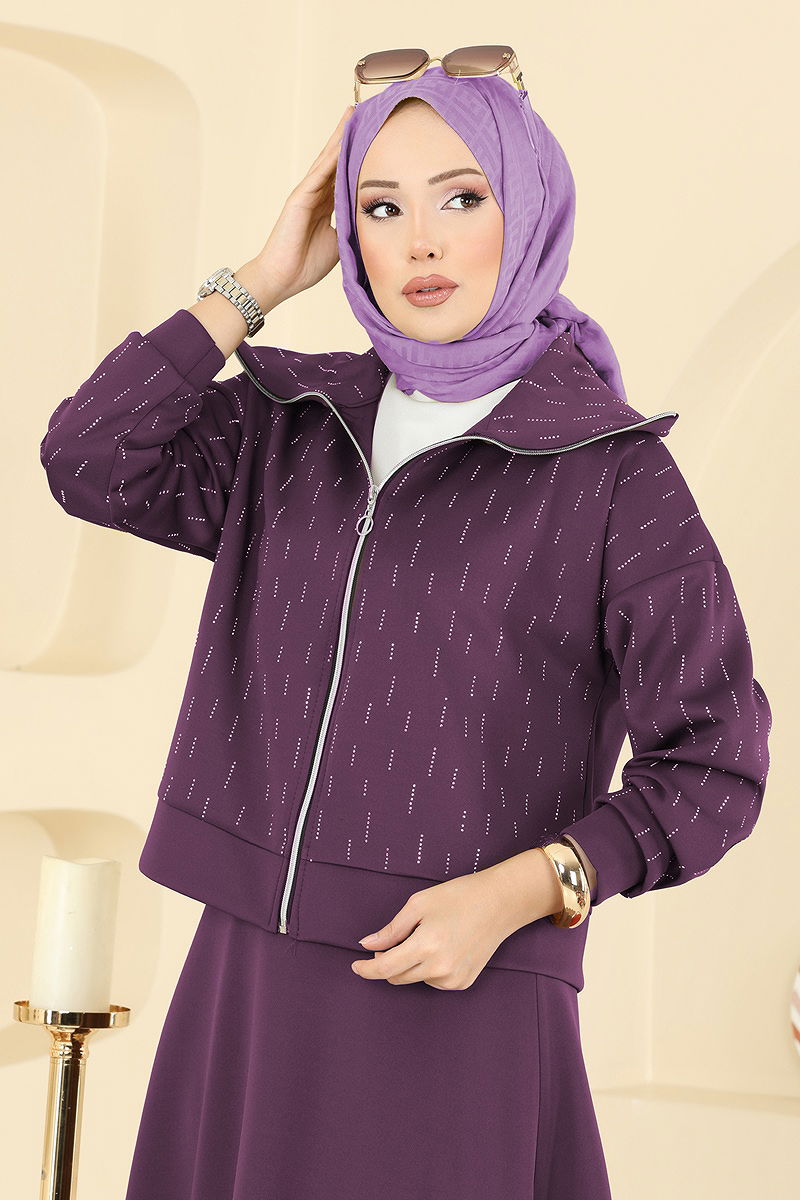 The Jeweled Scuba Skirt Set is specially designed for those who prefer modest clothing. This unique ensemble, which can be comfortably worn in all seasons, stands out with its feature of being washable at 30 degrees with delicate wash. Made from scuba fabric, this outfit features a stand-up collar and is unlined. The zipper on the front adds both elegance and practicality to the model. The stone details are adhesive and the waist of the skirt is designed with an elastic band for your comfort. The product displayed on the model is a size M and comes as a cardigan and skirt set.