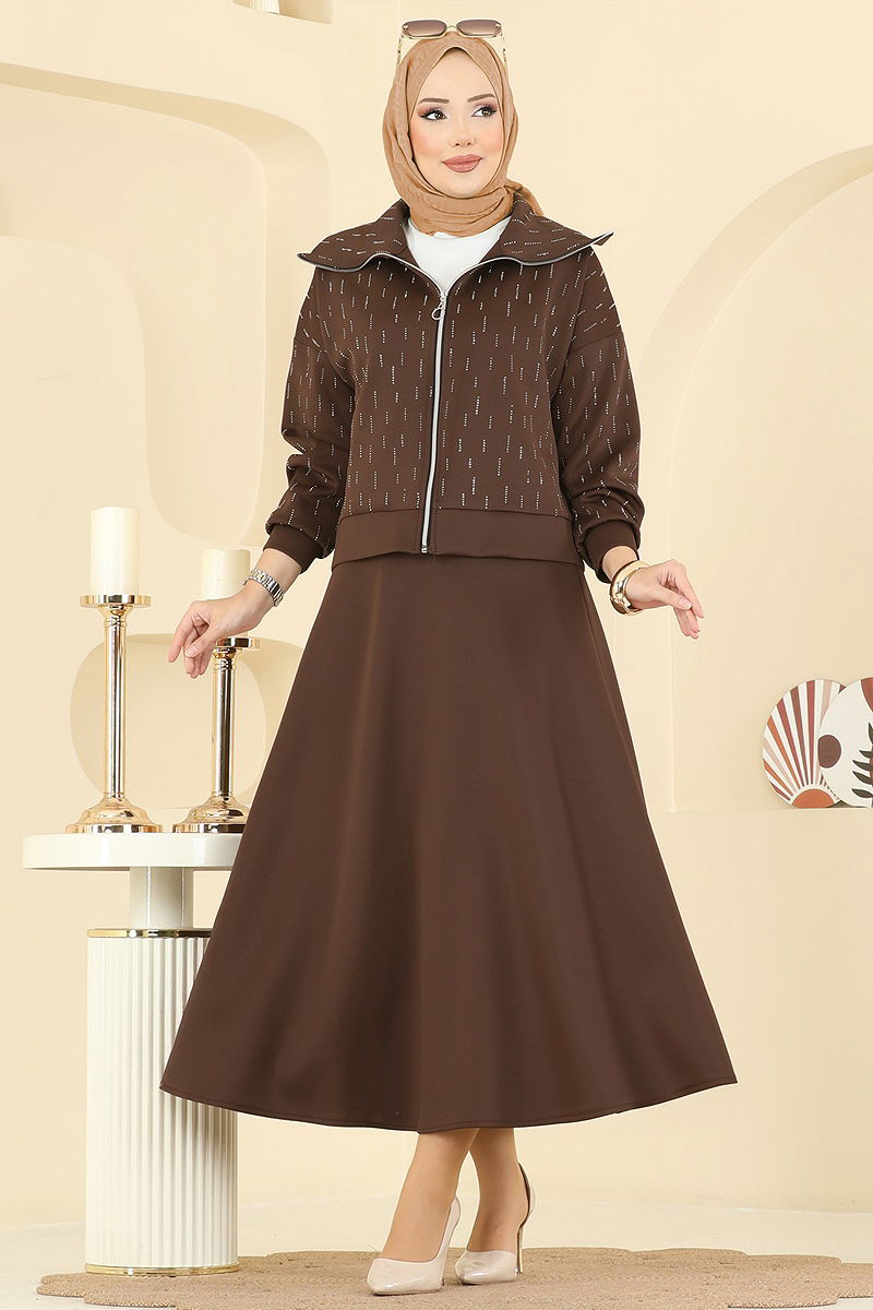 Product Feature : It is a new season hijab fashion product. The product has a Upright collar. Unlined. The product has a zipper at the From the front part. The stones are glued. The skirt waist is elastic. There may be a tonal difference in the product due to concept photo shoots.